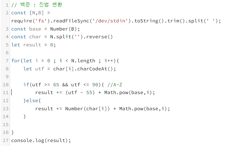 풀이에 대한 설명을 하자면 먼저 입력받아준 N과 B 중에서 밑수가 될 B를 정수형으로 변환하여 base에 저장합니다.