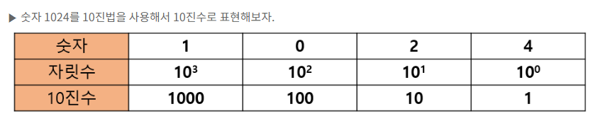 즉 (1 * 10^3) + (0 * 10^2) + (2 * 10^1) + (4 * 10^0) = 1024