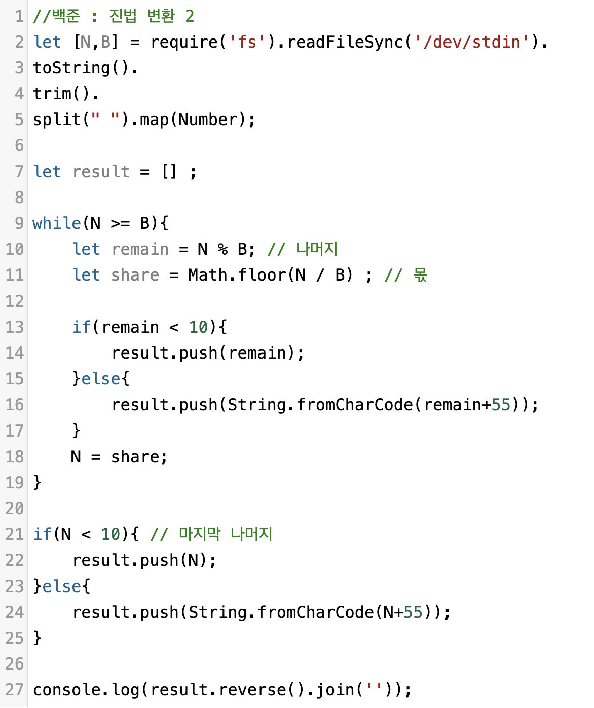 1 번째 주의점을 생각하여 나머지가 10 이하면 그대로 result에 push, 10 이상이면 똑같이 fromCharCode() 메서드와 55를 더해주어 push 해줍니다.
