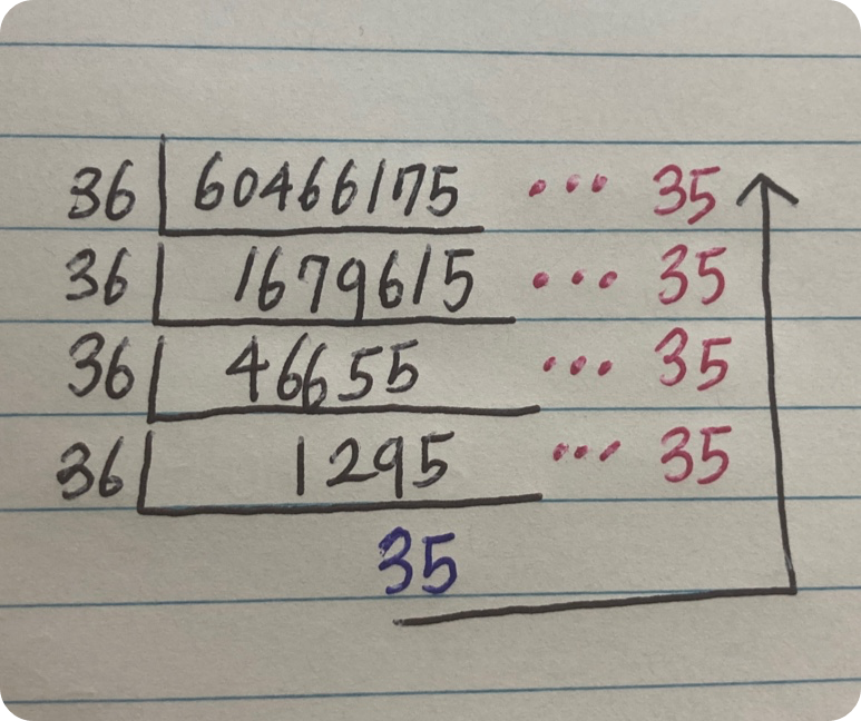 그러면 진법 계산을 문제에 적용하면 35, 35, 35, 35, 35 가 나오게 되는데, 이를 문제에서 10진법을 넘어가는 수는 새롭게 정의한 진법으로 표시하면 됩니다.