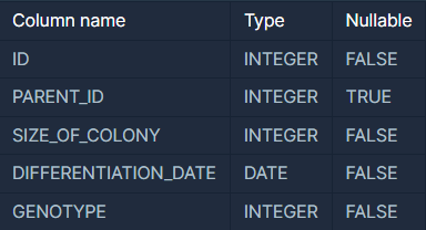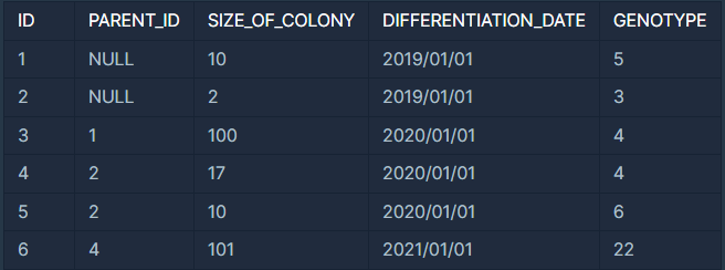 다음은 실험실에서 배양한 대장균들의 정보를 담은 ECOLI_DATA 테이블입니다. ECOLI_DATA 테이블의 구조는 다음과 같으며, ID, PARENT_ID, SIZE_OF_COLONY, DIFFERENTIATION_DATE, GENOTYPE 은 각각 대장균 개체의 ID, 부모 개체의 ID, 개체의 크기, 분화되어 나온 날짜, 개체의 형질을 나타냅니다.