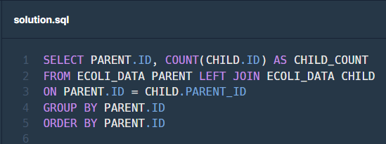 스칼라 서브쿼리의 WHERE절에서 부모의 아이디(CHILD.PARENT_ID)와 부모 자신의 아이디 (PARENT.ID)을 조건을 줘서 대장균들의 자식의 수를 구해줍니다.