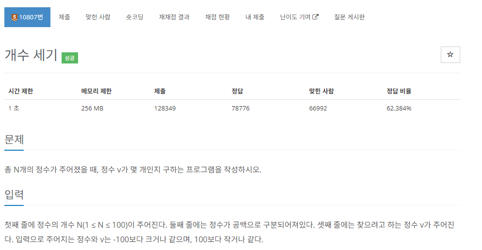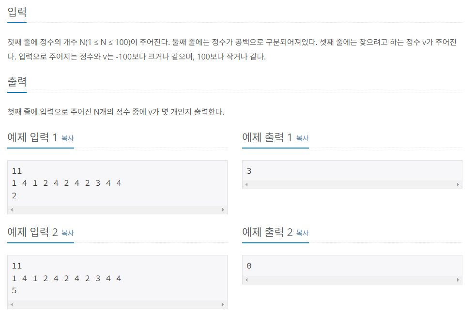 마지막으로 3번째 입력을 받아서 target변수에 넣어주고, arr배열을 순회하면서 target과 같은 정수를 발견했을 때는 count를 증가해 주는 방식으로 마무리해주었습니다.