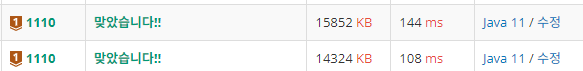 캐스팅이 많이 일어나는 코드이기 때문에 가독성이 좋지 않은 것 같지만 속도는 108ms로 "다른 풀이"에서 설명할 코드의 144ms 보다는 속도가 빠르게 나왔습니다.