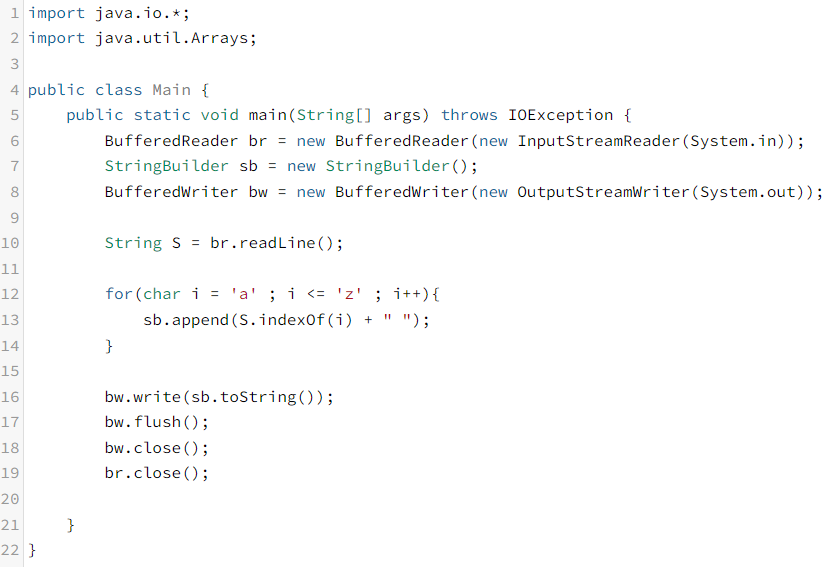 S에 입력을 받아주고, Arrays.fill() 메서드를 사용하여 alphabet 배열에 "-1"을 모두 넣어주었습니다.