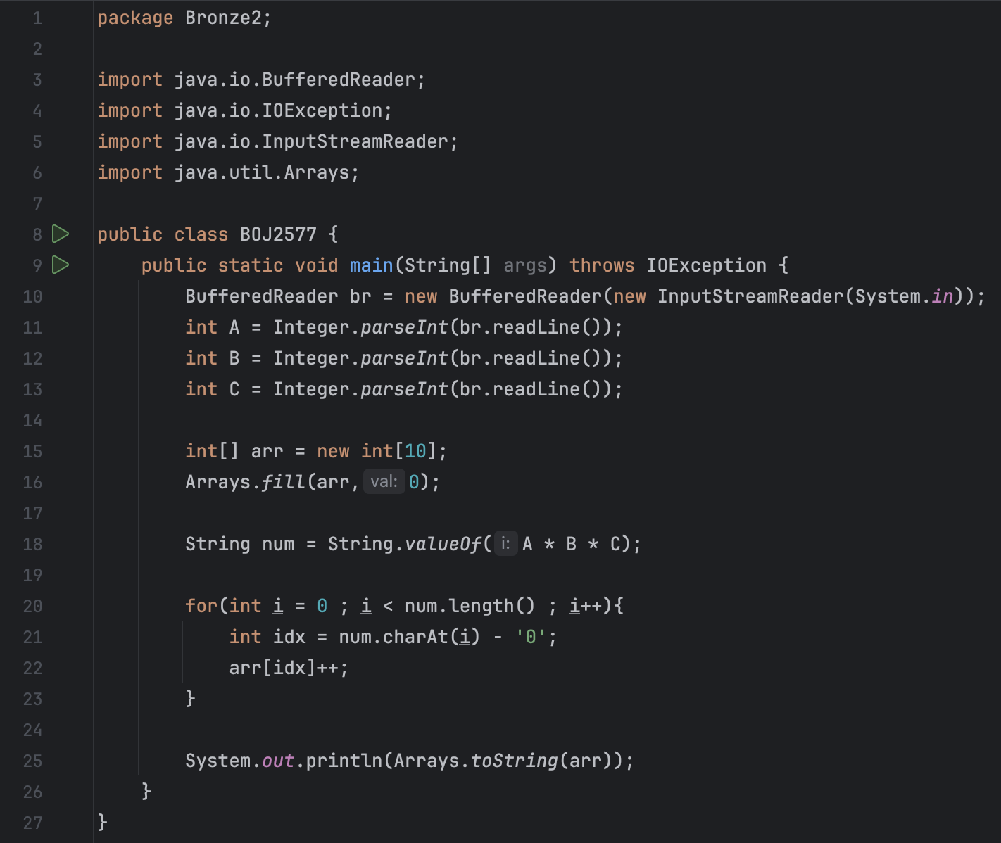 그리고 0에서 9까지 각각의 숫자가 몇번 나왔는지 계산해야 하기 때문에 0~9까지의 길이가 10인 배열 arr를 생성해 주고, Arrays.fill() 함수를 사용하여 arr배열을 0으로 채워줍니다.