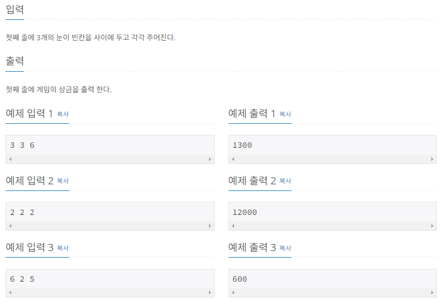 주사위 3개의 테스트 케이스는 다음과 같습니다.