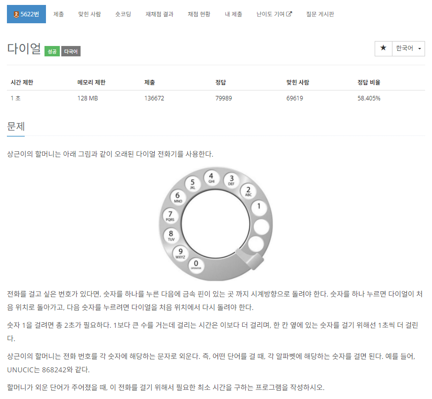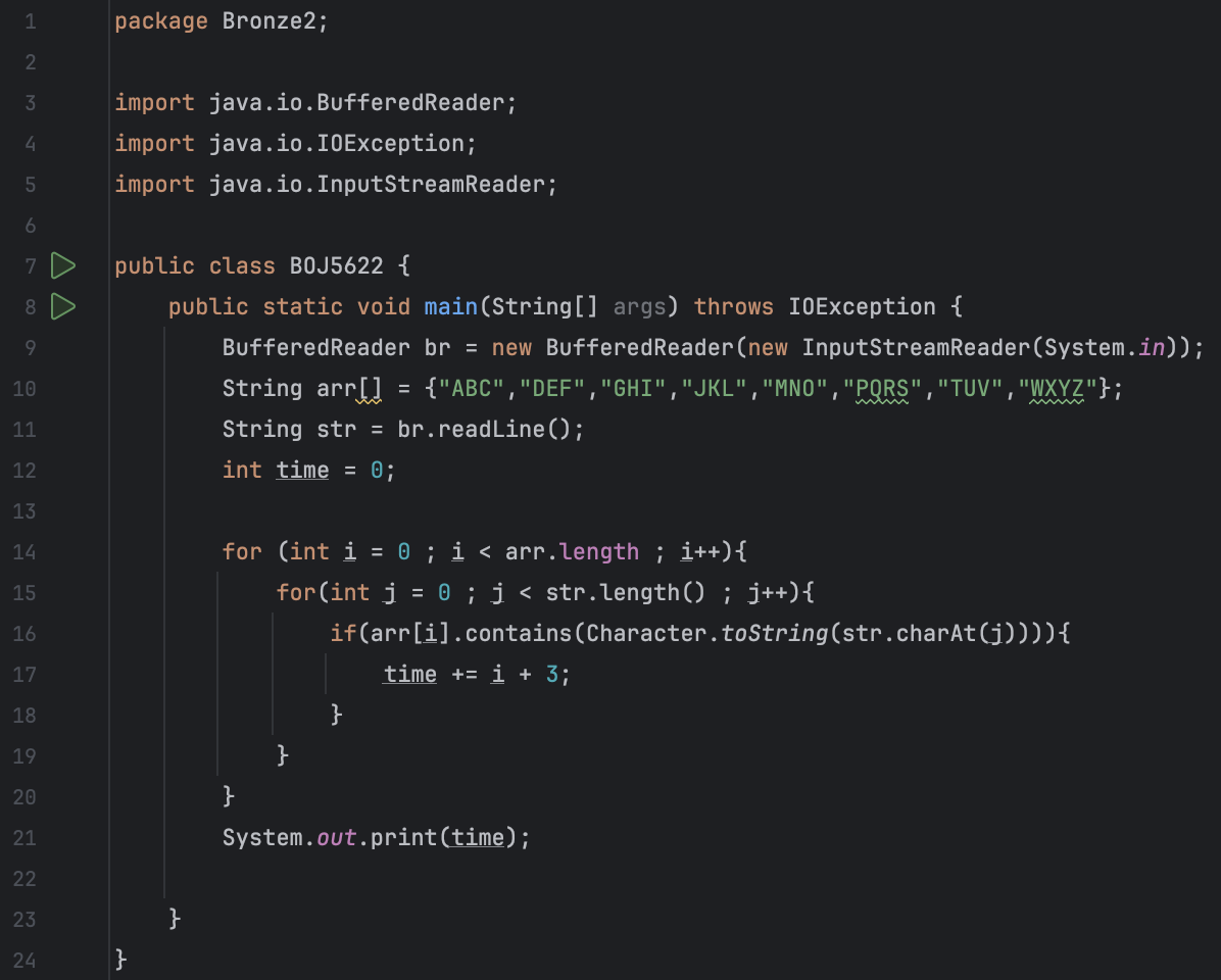 마저 설명을 하자면 if문 조건식을 만족하여 time변수에 3씩 더해줍니다. 이때 3씩더하는 이유는, 숫자 2를 누르는 데 기본적으로 3초가 걸리고, 이후 숫자마다 1초씩 더 걸리기 때문입니다.