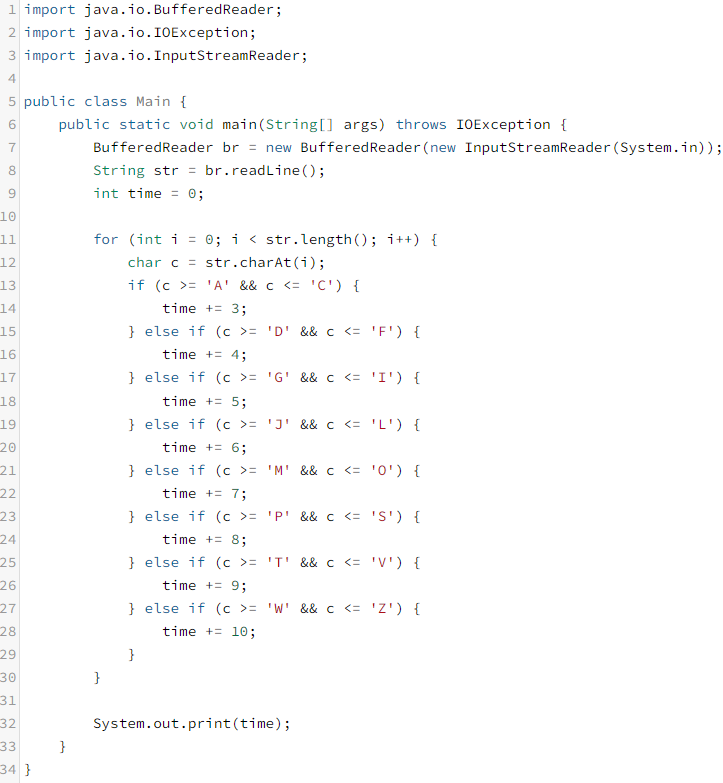 상근이의 할머니는 다이얼 입력을 문자열로 받기 때문에 문자열을 입력받아서 각 문자열을 charAt() 함수를 사용하여 문자열을 분리해 주고, 해당 문자에 맞는 다이얼을 더해주는 식으로 작성했습니다.