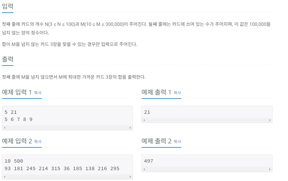 전체 카드(N)중에서 3개를 고를 수 있는 모든 경우의 수를 구하고, 카드의 합을 구한 뒤, M을 넘지 않는 최댓값을 찾으면 되는 문제입니다.