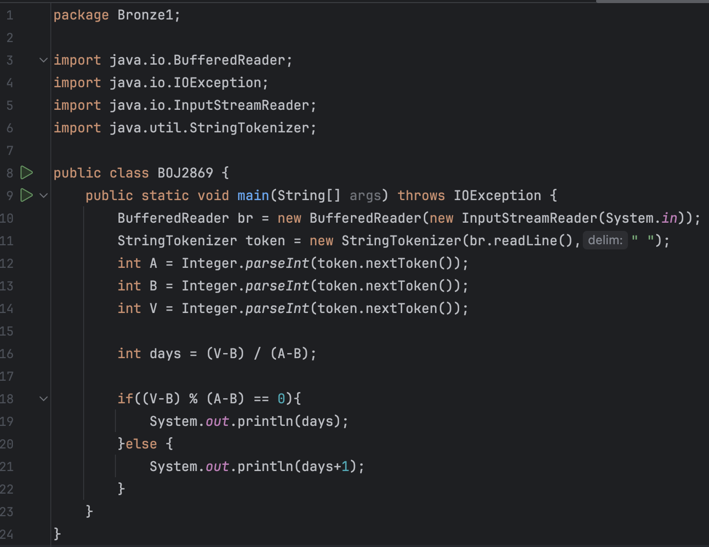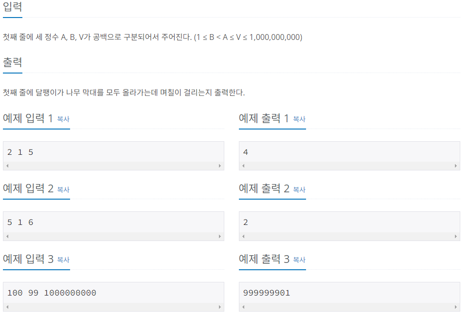 코드 설명을 하자면 빠른 입력을 위해서 BufferedReader 클래스를 사용해 주고, 정수형으로 캐스팅하여 A, B, V에 초기화해 줍니다.