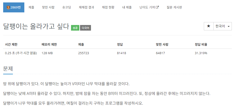 - 하루 동안 순수하게 올라가는 높이: 𝐴 − 𝐵