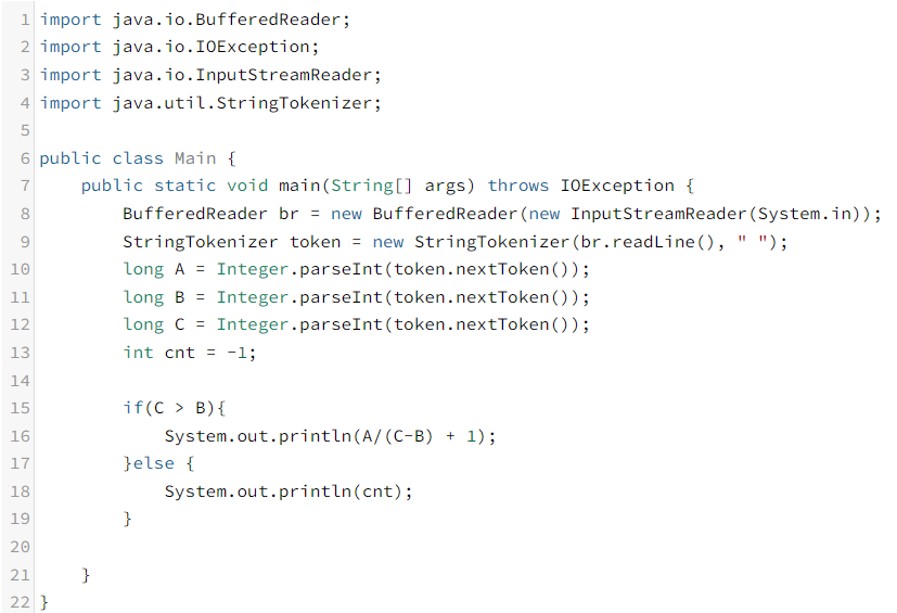 코드를 설명하자면 먼저 빠른 입력을 위해서 BufferedReader 클래스를 사용해 줍니다. 그리고 손익분기점을 찾지 못하면 -1을 반환해야 하기 때문에 cnt를 -1로 초기화해 줍니다.