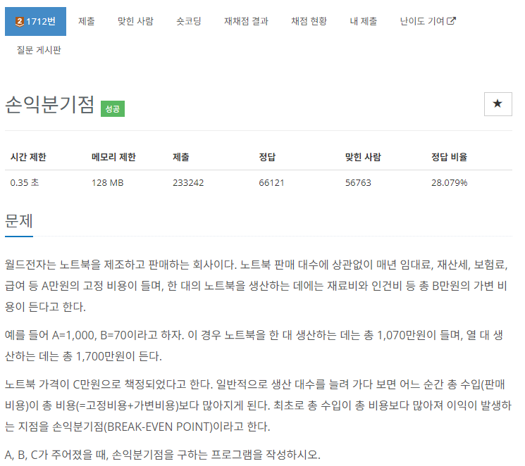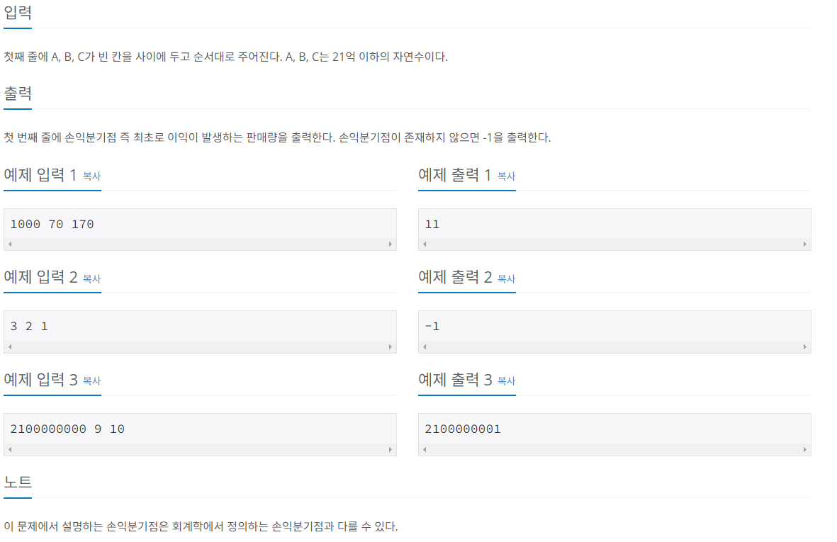 이번 문제는 주어진 비용과 수익을 이용하여 손익 분기점을 찾는 문제입니다.