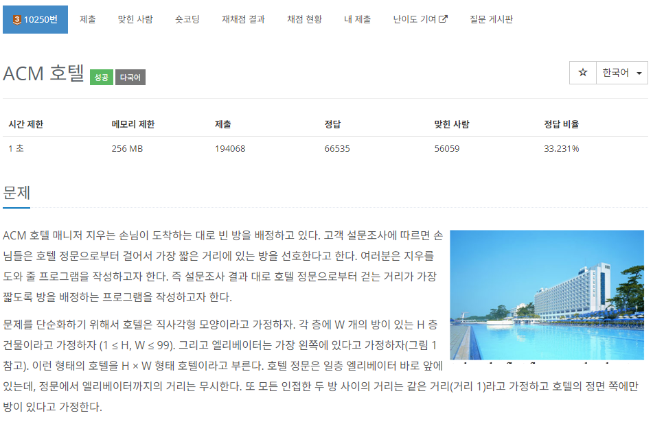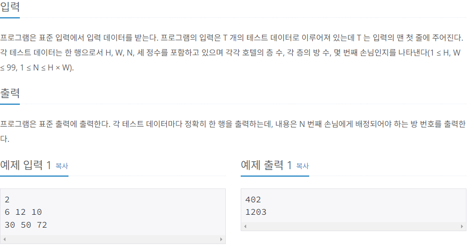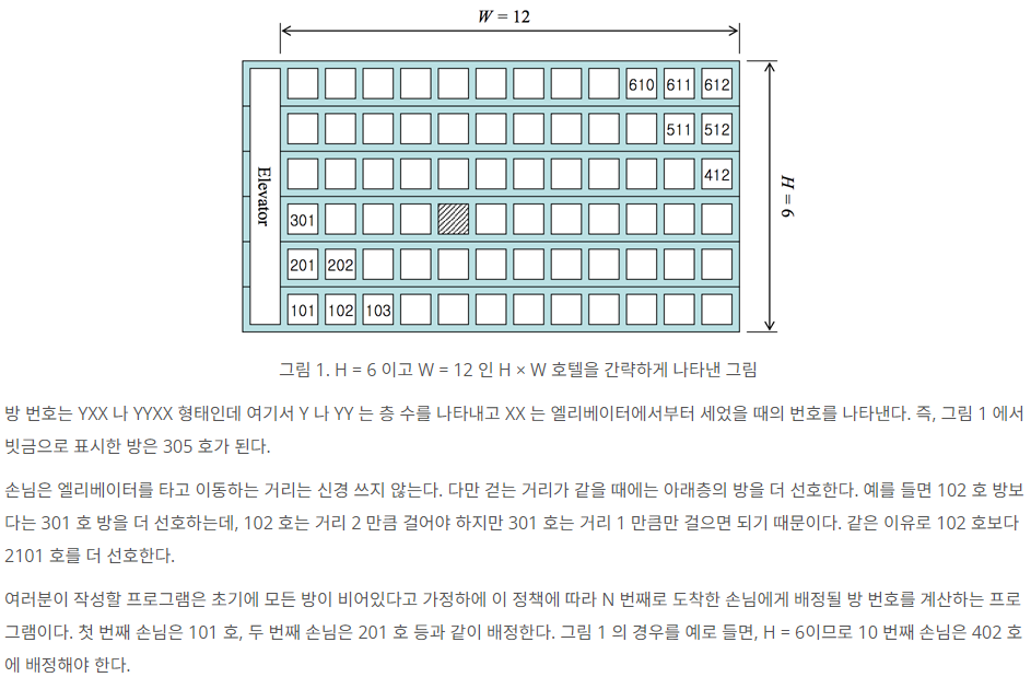 이번 문제는 ACM호텔에는 H층, 각 층마다 W개의 방이 있으며 N번째 손님에게 배정될 방 번호를 구하는 문제입니다.