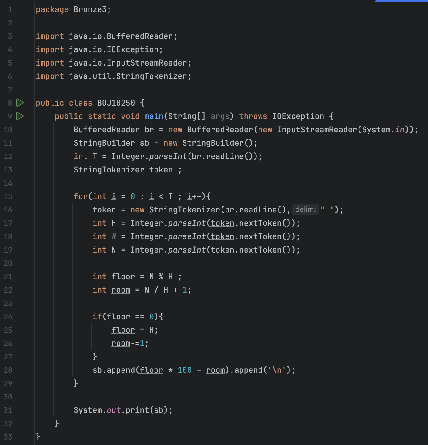 입력받은 T만큼 반복문을 순회하는 데 H, W, N을 정수형으로 캐스팅하여 저장해 줍니다.