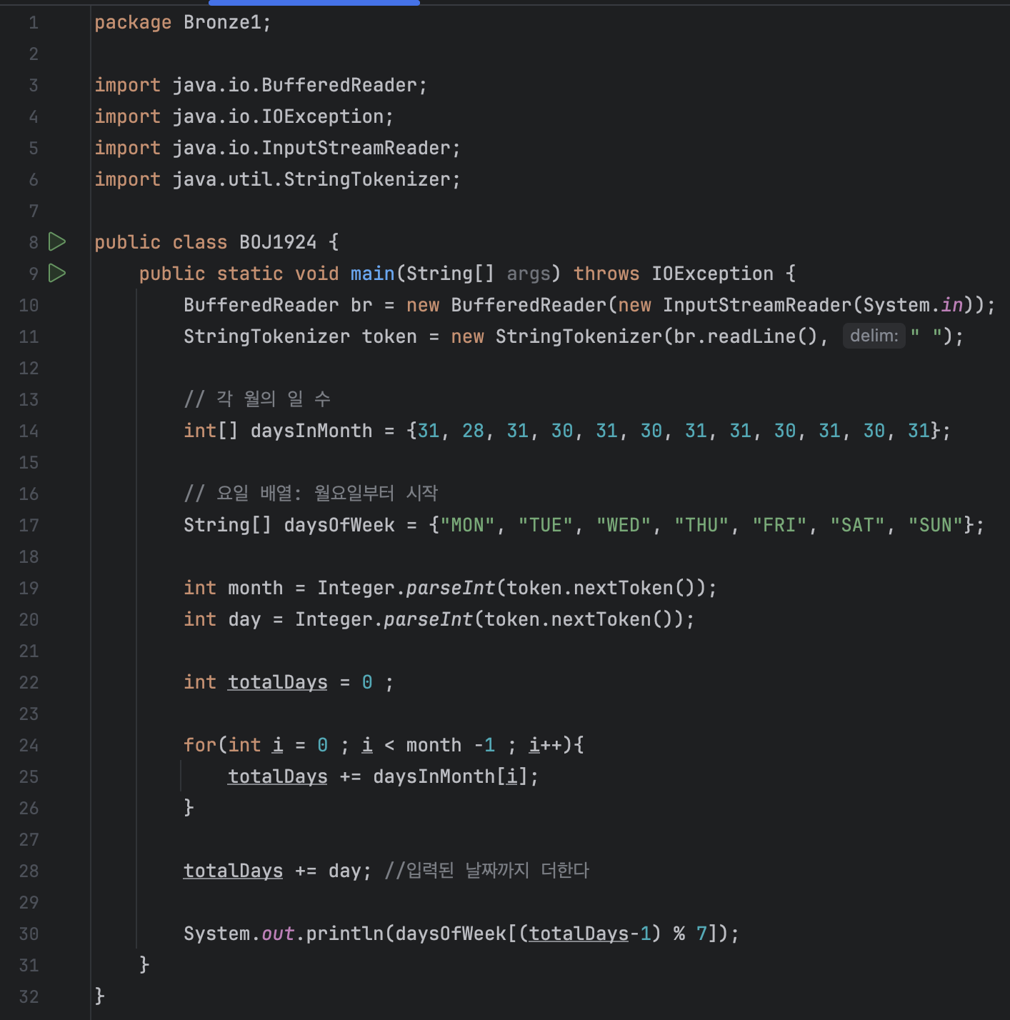 먼저 빠른 입력을 위해 BufferedReader 클래스를 사용하여 입력을 받아주고, 입력된 날짜를 공백을 기준으로 분리할 수 있도록 StringTokenizer 클래스를 사용하여 분리를 해주었습니다.