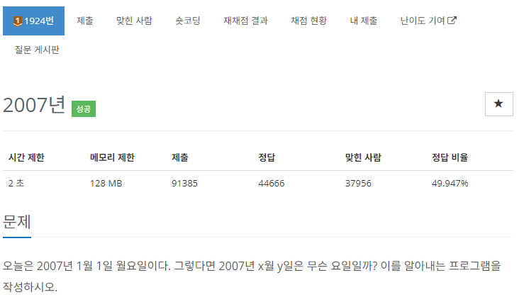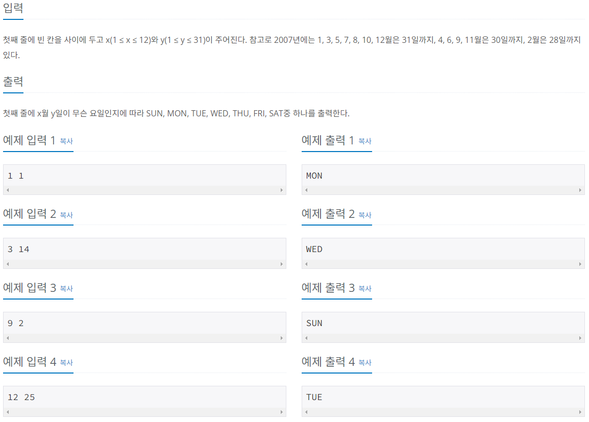 입력이 주어질 때 해당 날짜에 대한 요일을 구하는 문제입니다.