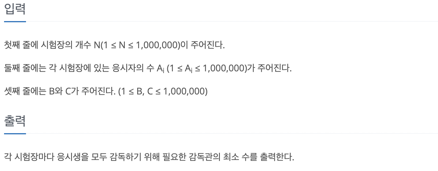 문제에서 그리디 알고리즘을 활용할 수 있는 이유는 각 시험장마다 주 감독관과 부 감독관의 수를 최소화하여야 하기 때문입니다.