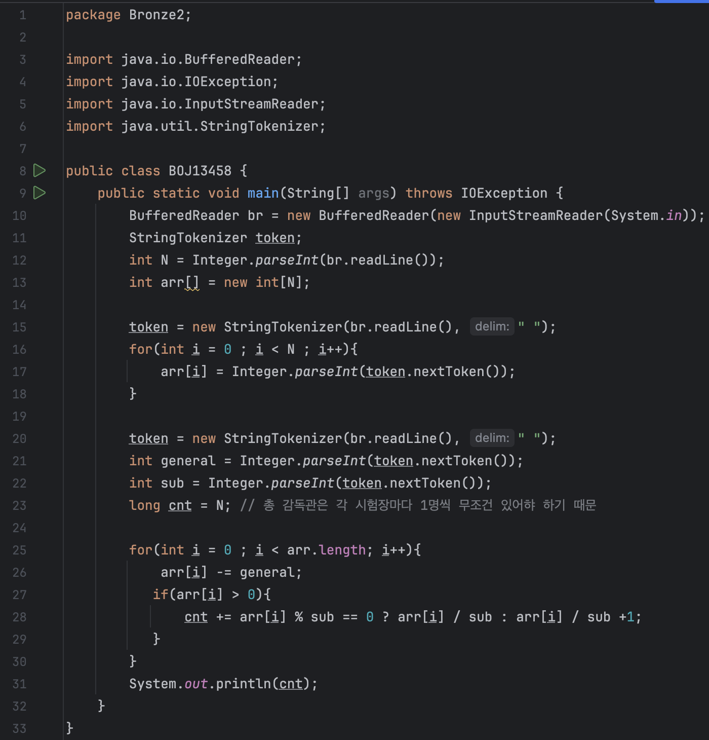 먼저 문제에서 나온 대로 입력을 받아주고, 감독관의 수(cnt)를 N으로 초기화 해줍니다. 이는 주석에서 볼 수 있듯이 각 시험장마다 무조건 1명의 총감독관이 있어햐하기 때문입니다.
