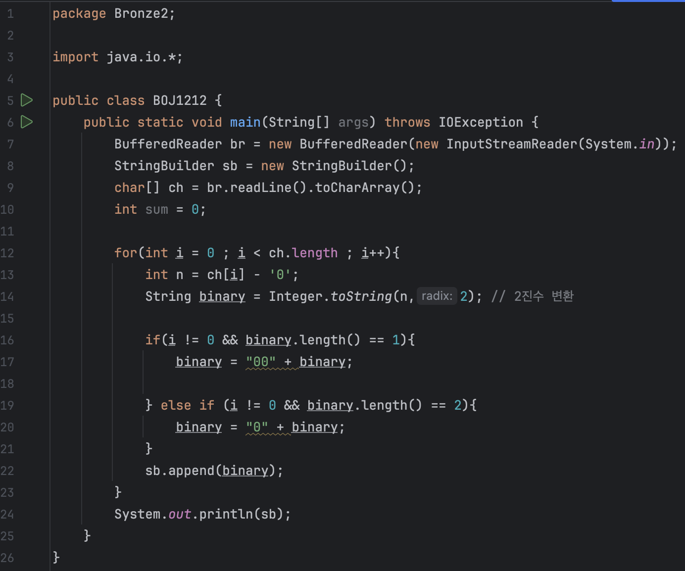 그리고 ch배열의 길이만큼 반복하는 for문을 선언하고, 각 요소를 숫자로 변환해 주고, toString() 메서드를 사용하여 2진수로 변환해줍니다.