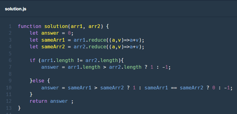 7번째 줄에서 기본 삼항연산자를 사용하여 리턴할 answer에 값을 넣어주고, 9번째 else 문 (arr1과 arr2의 길이가 같을 때)에서 다중 삼항연산자를 사용하여 문제에서 정의한대로 반환값을 넣어주었습니다.