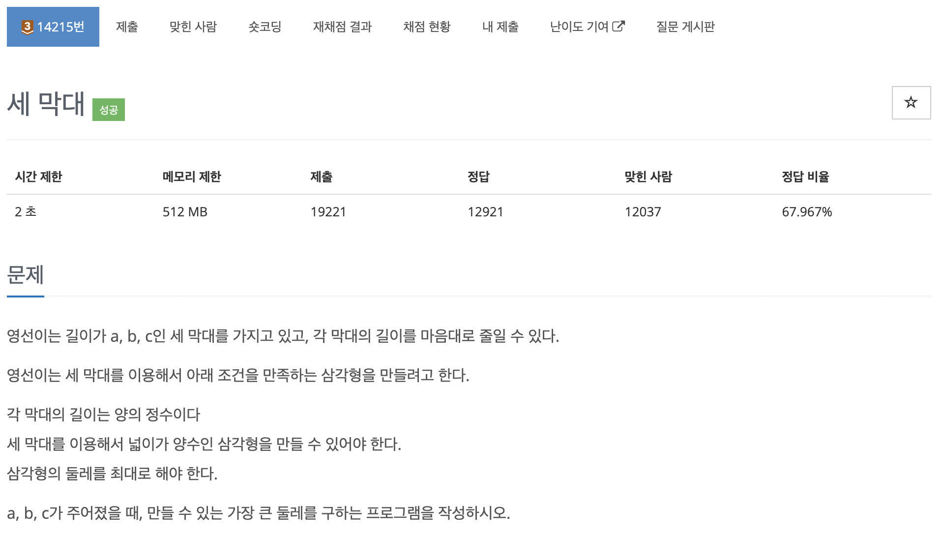 따라서 "삼각형의 둘레를 최대로 유지하면서 길이를 조절해야 한다"라는 뜻이기 때문에 이 말을 생각해 보면 C가 A+B보다 1만 작으면 최소한의 길이를 줄이는 것입니다.