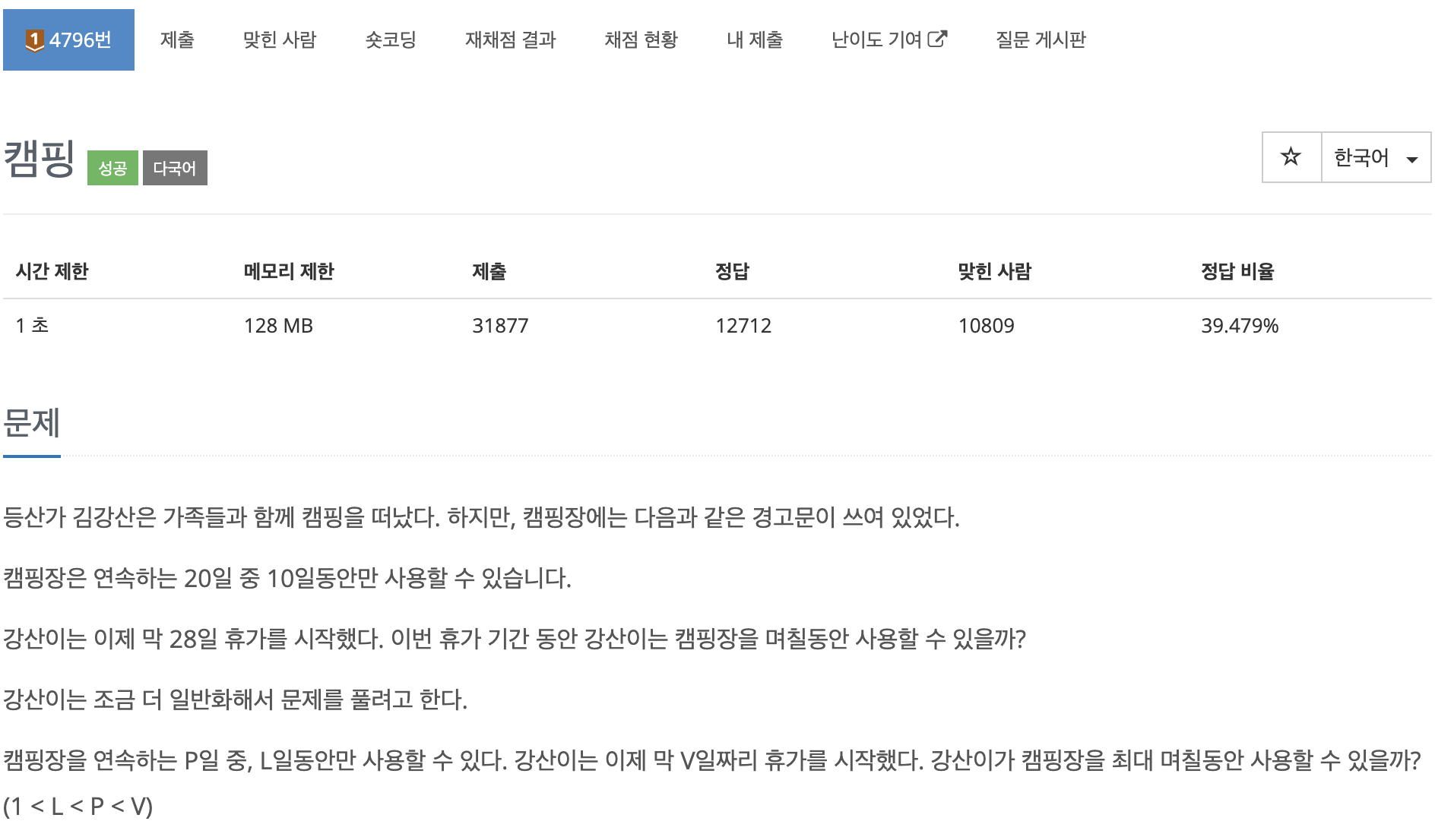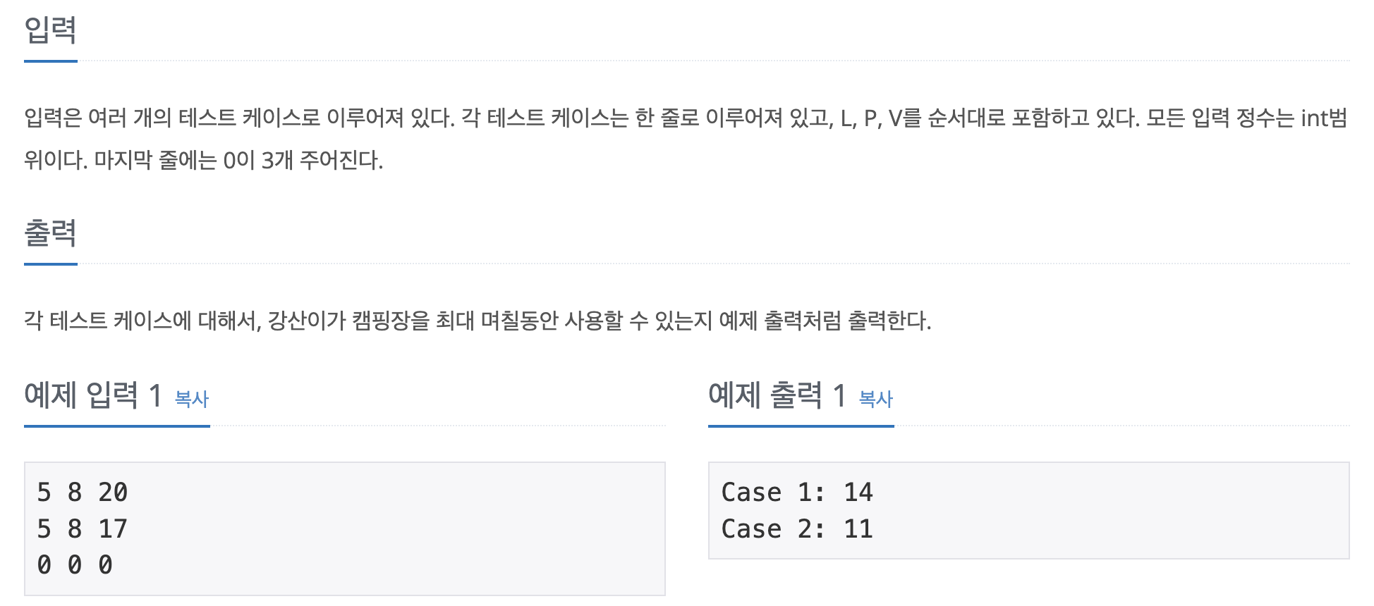 이번 문제는 주어진 휴가 일 수와 캠핑장의 영업 일 수에 따라서 캠핑을 할 수 있는 최대 일 수를 계산하는 문제입니다.