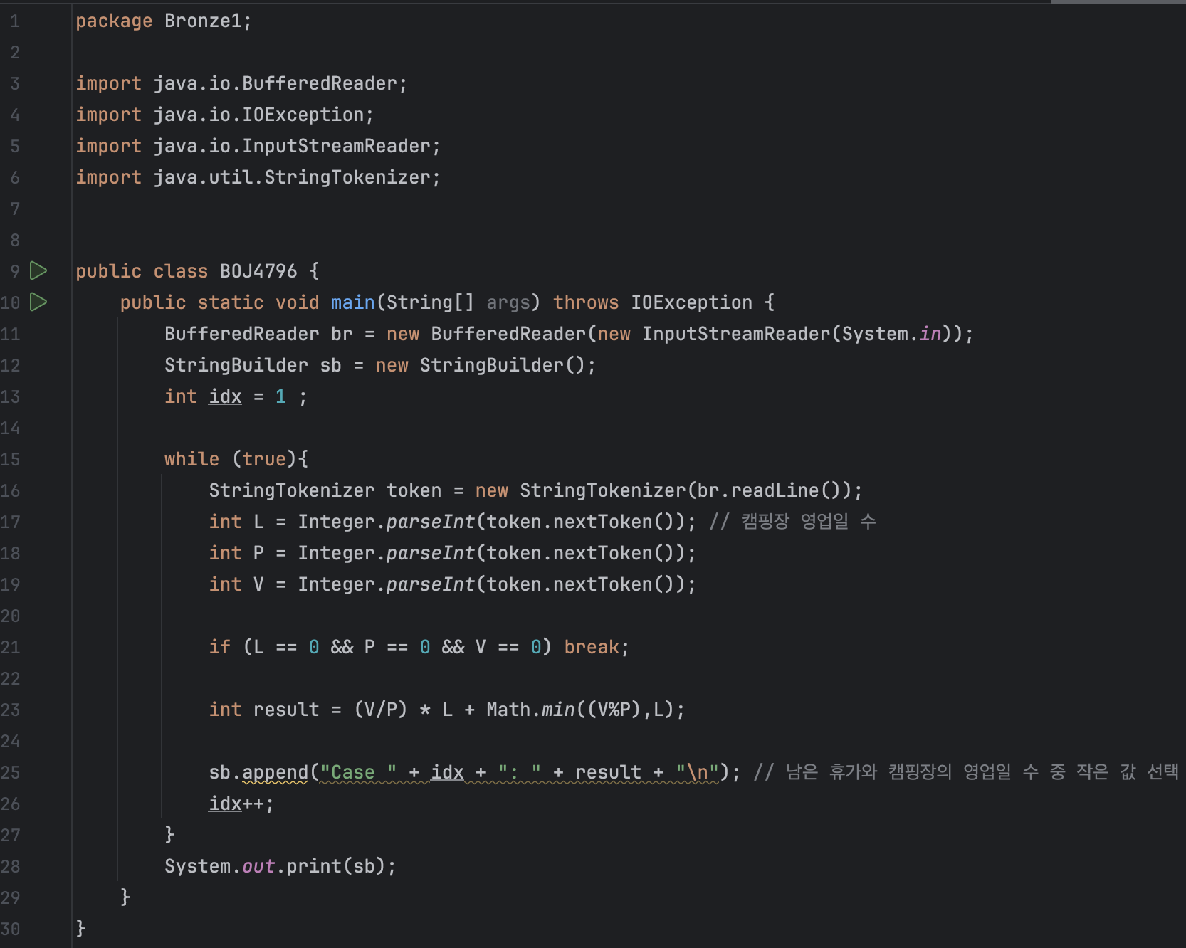0 0 0이 입력된다면 break문으로 반복문을 빠져나오고, 휴가 일 수를 P로 나누어 몫을 구합니다. 이는 캠핑이 가능한 "주기 수"입니다.
