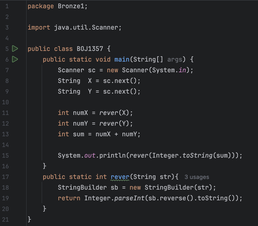 StringBuilder의 reverse() 메서드를 사용하는 부분을 하나로 묶어 함수로 선언했습니다.