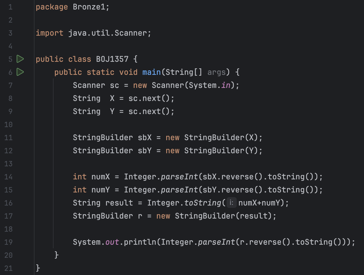 뒤집어준 문자열 숫자를 연산을 해야 하기 때문에 Integer.parseInt() 메서드로 정수형으로 캐스팅을 해줘야합니다.
