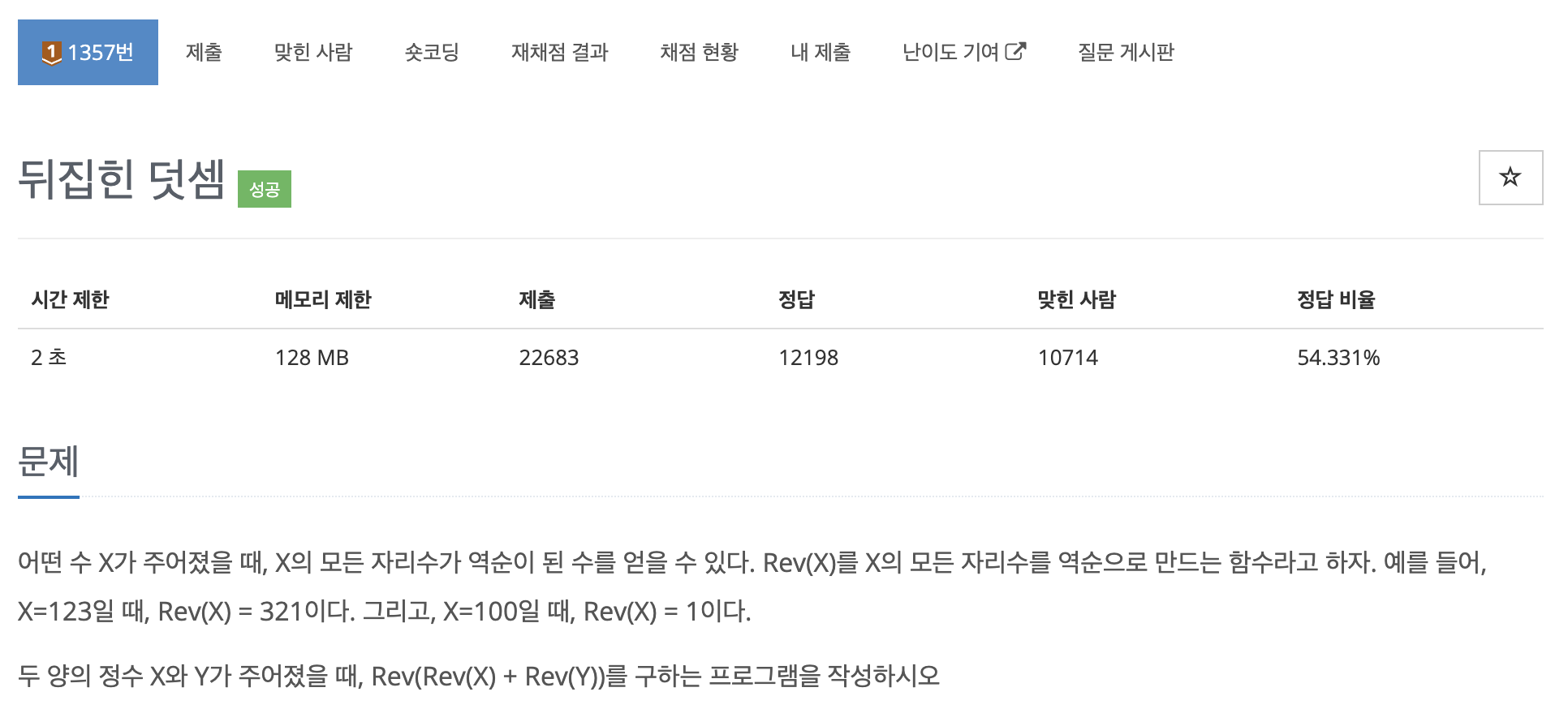 이번 문제는 입력된 문자열 숫자를 뒤집어서 더하고 다시 뒤집어서 출력하는 문제입니다.