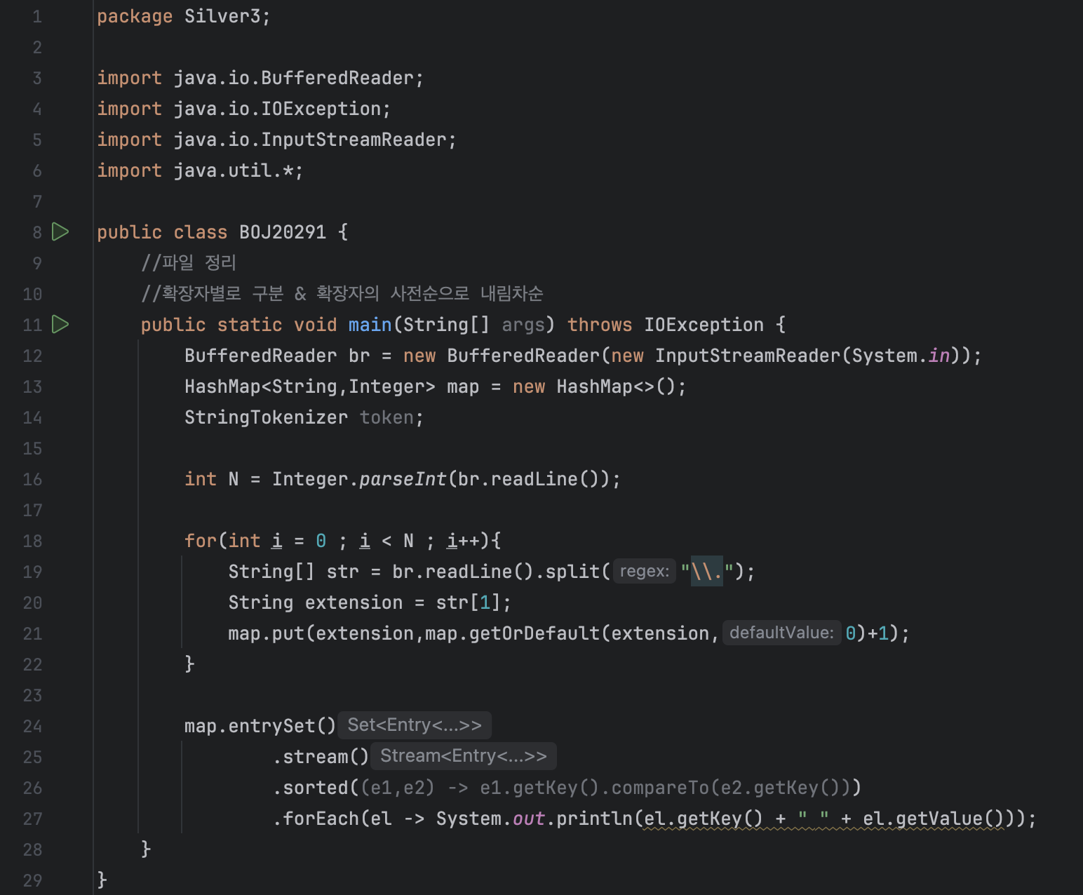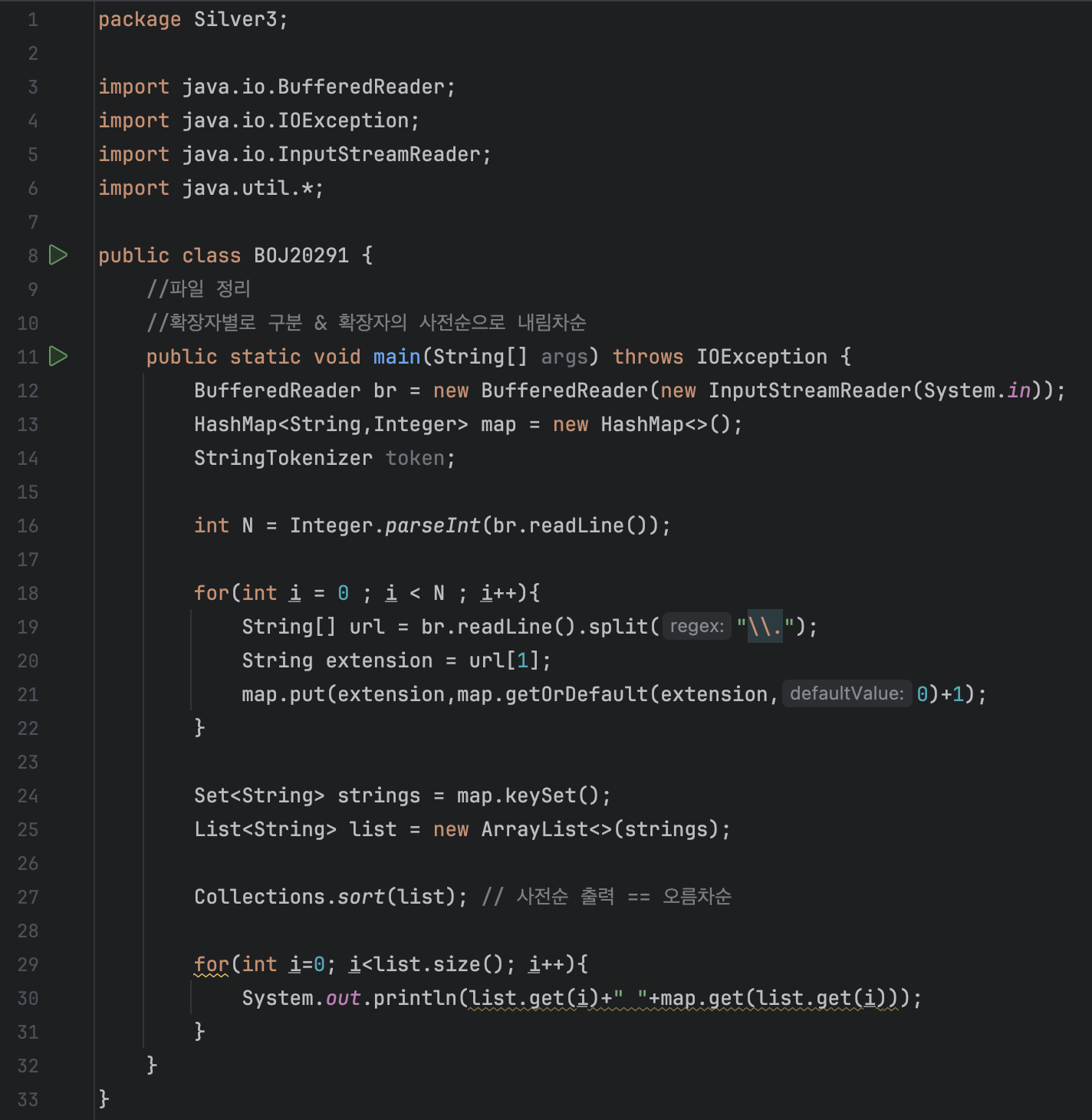 문제를 딱 보면 HashSet을 사용하기에 적합합니다. 먼저 빠른 입력을 위해 BufferedReader클래스를 사용하여 입력을 받아주고, 확장자를 구분하기 위해서 StringTokenizer를 사용하여 token별로 구분해 줍니다.