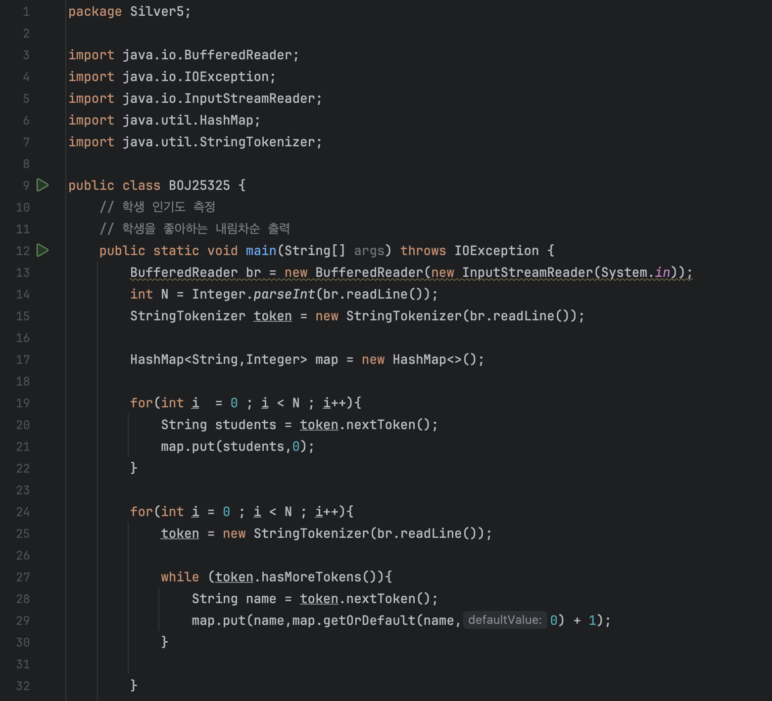 첫째 줄에 주어진 학생을 map에 넣어주고, 각 학생들이 좋아하는 학생의 정보를 토큰으로 받아 while문에서 token이 더 이상 토큰을 가지고 있지 않을 때까지 반복합니다.