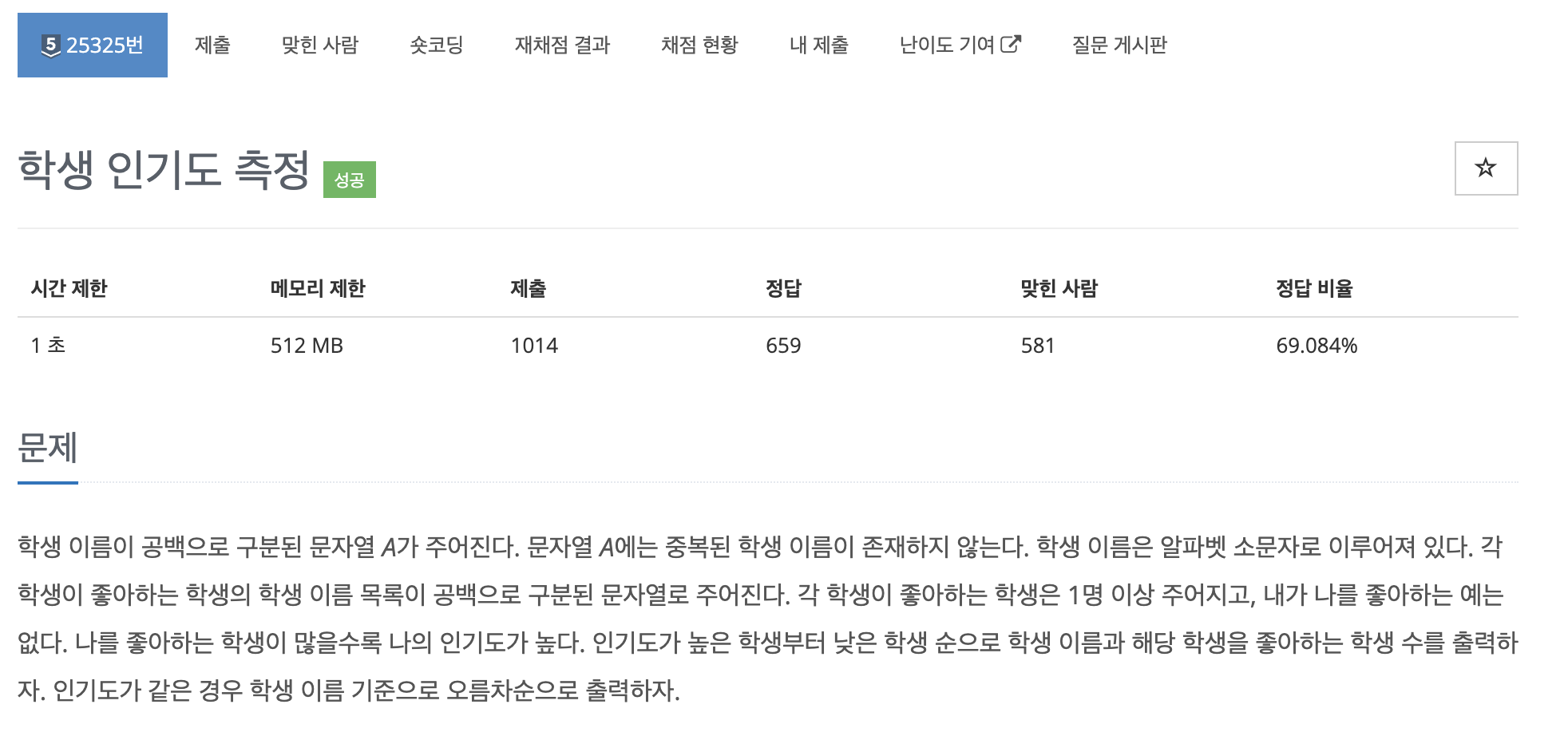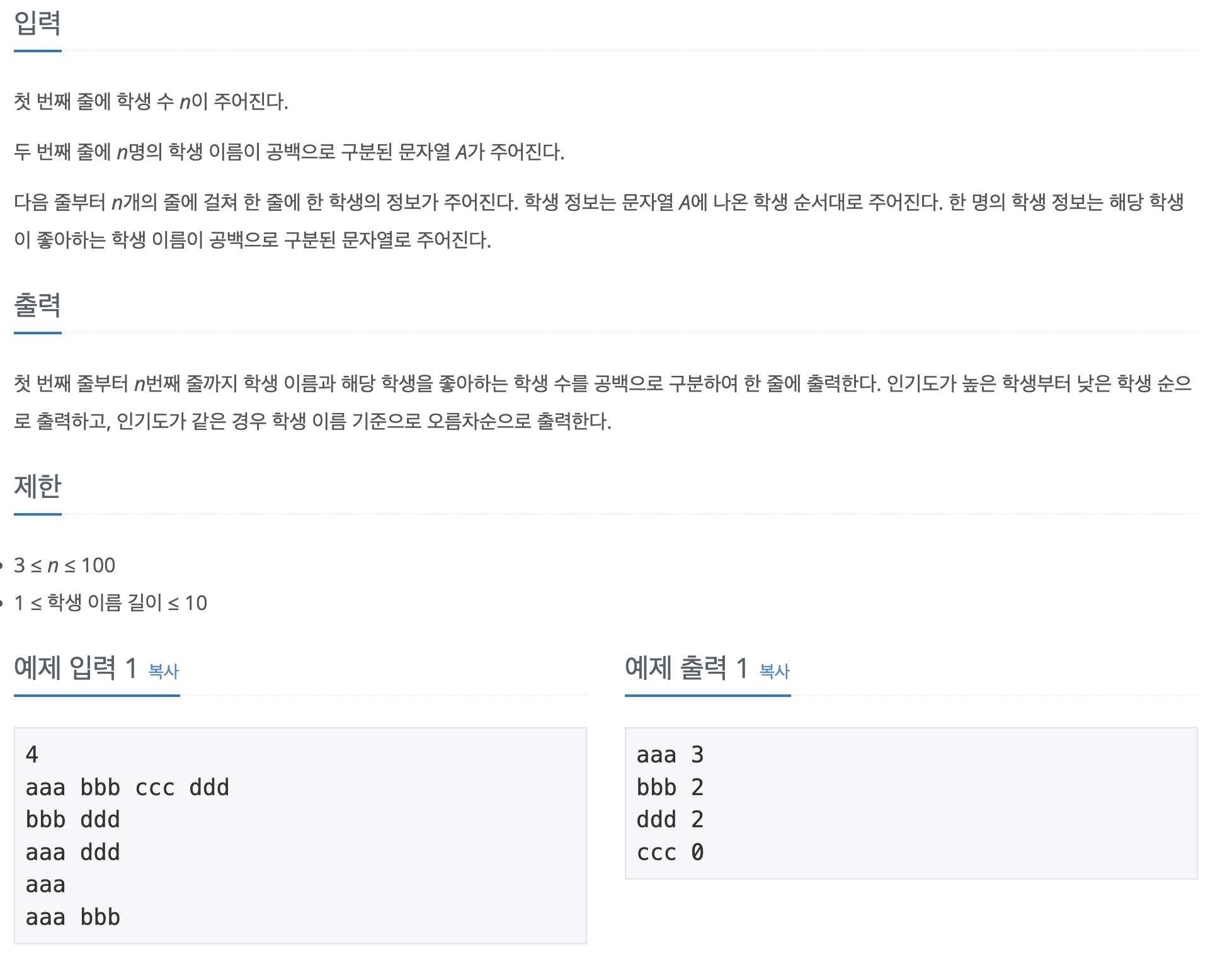 이번 문제는 각 학생이 좋아하는 학생의 학생 이름 목록이 공백으로 구분된 문자열로 주어질 때 좋아하는 사람을 체크한 후 인기도가 높은 학생부터 낮은 학생 순으로 출력(내림차순)하고, 인기도가 같은 경우 학생 이름 기준으로 오름차순으로 출력하는 문제입니다.