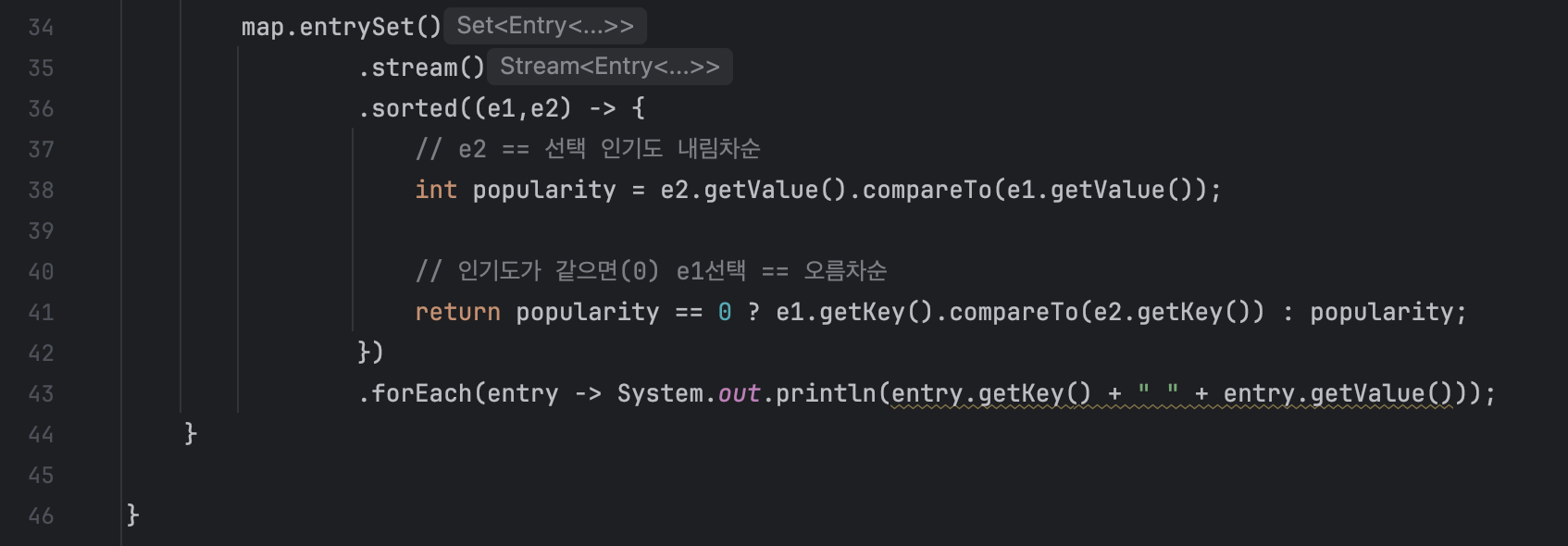 - e1과 e2는 Map.Entry <String, Integer> 타입의 객체로, 각각 key와 value를 가지고 있습니다.