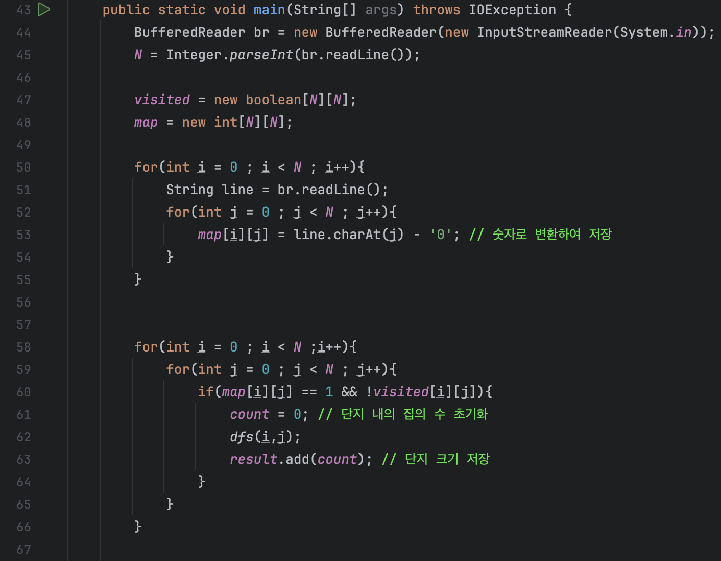 main문에서는 빠른 입력을 받기 위해서 BufferedReader클래스를 사용하여 입력을 받아줍니다. 방문 여부를 확인할 visited배열과 지도 map의 크기를 입력받은 크기 N만큼 초기화해 줍니다.