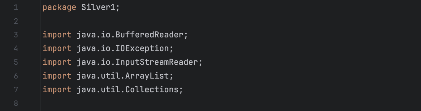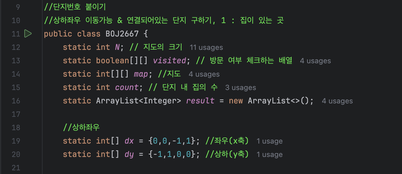 먼저 가독성을 높이기위하여 계속 사용되는 변수들을 전역 변수로 선언해주고, 단지가 몇 개인지 모르기 때문에 동적으로 크기를 조절할 수 있도록 ArrayList를 초기화해줍니다.