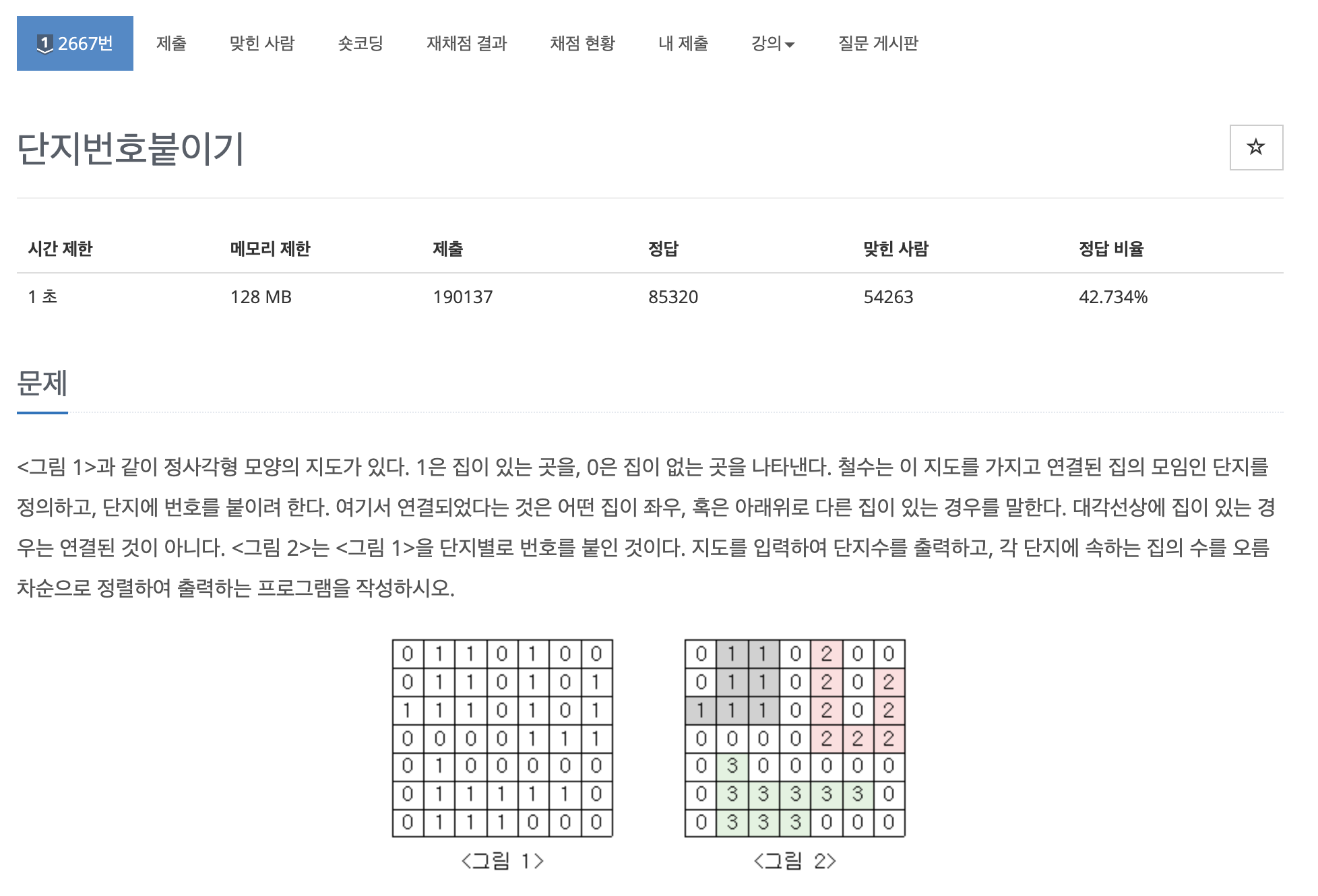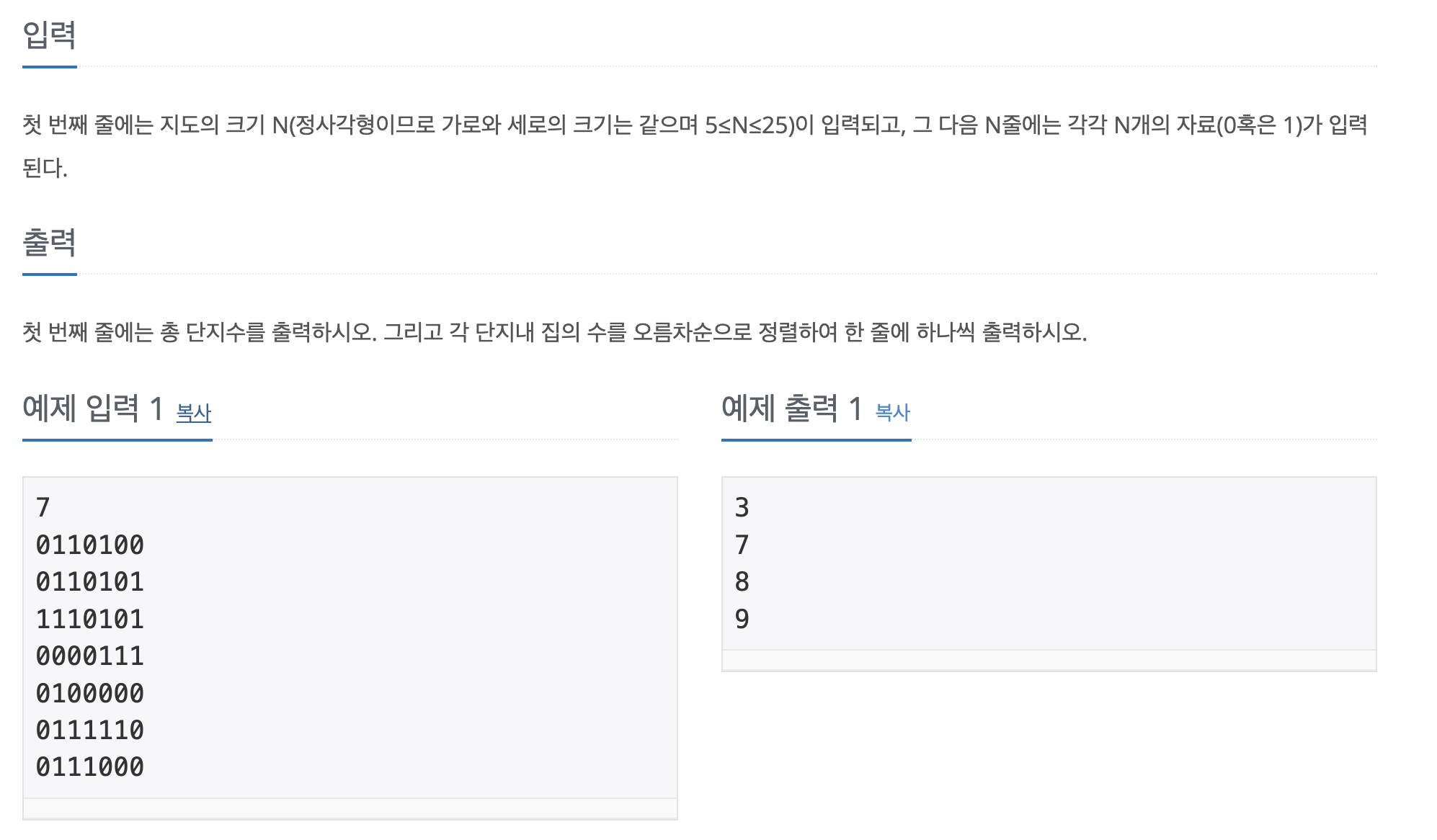 먼저 이번 문제는 정사각형 N(지도의 크기)이 주어질 때 집이 있는 곳은 1 없는 곳은 0입니다. 이때 연결되어 있는 집을 단지로 구분하여 단지의 수와 크기를 출력하는 문제입니다.