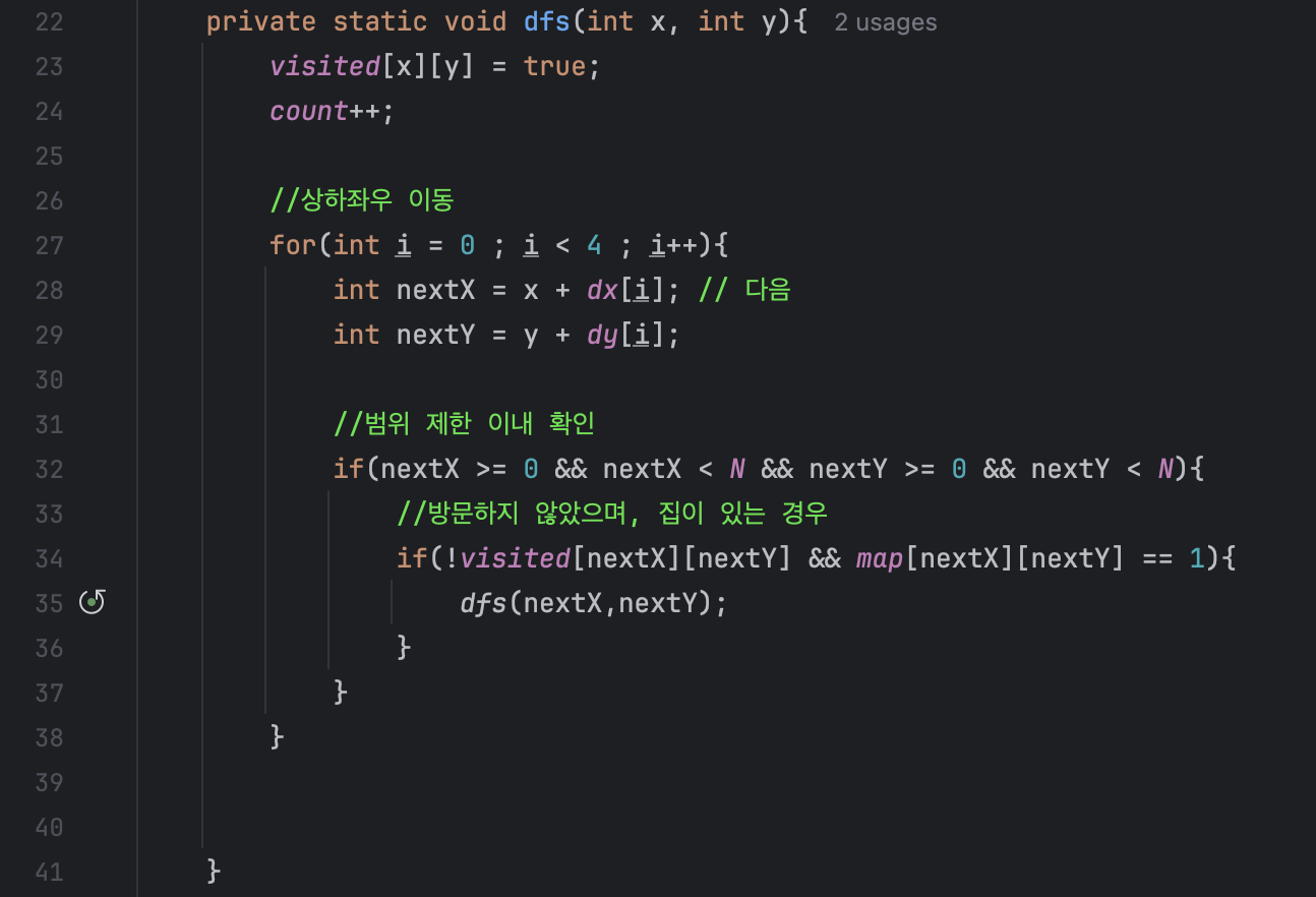 범위를 지정하지 않으면 무한 루프에 빠질 수 있으므로, 배열의 범위를 벗어나지 않도록 제한을 설정해야 합니다. 그리고 다음 위치가 아직 방문하지 않았으며, 집이 있는 경우(1) 다음 위치로 재귀 호출을 수행합니다.