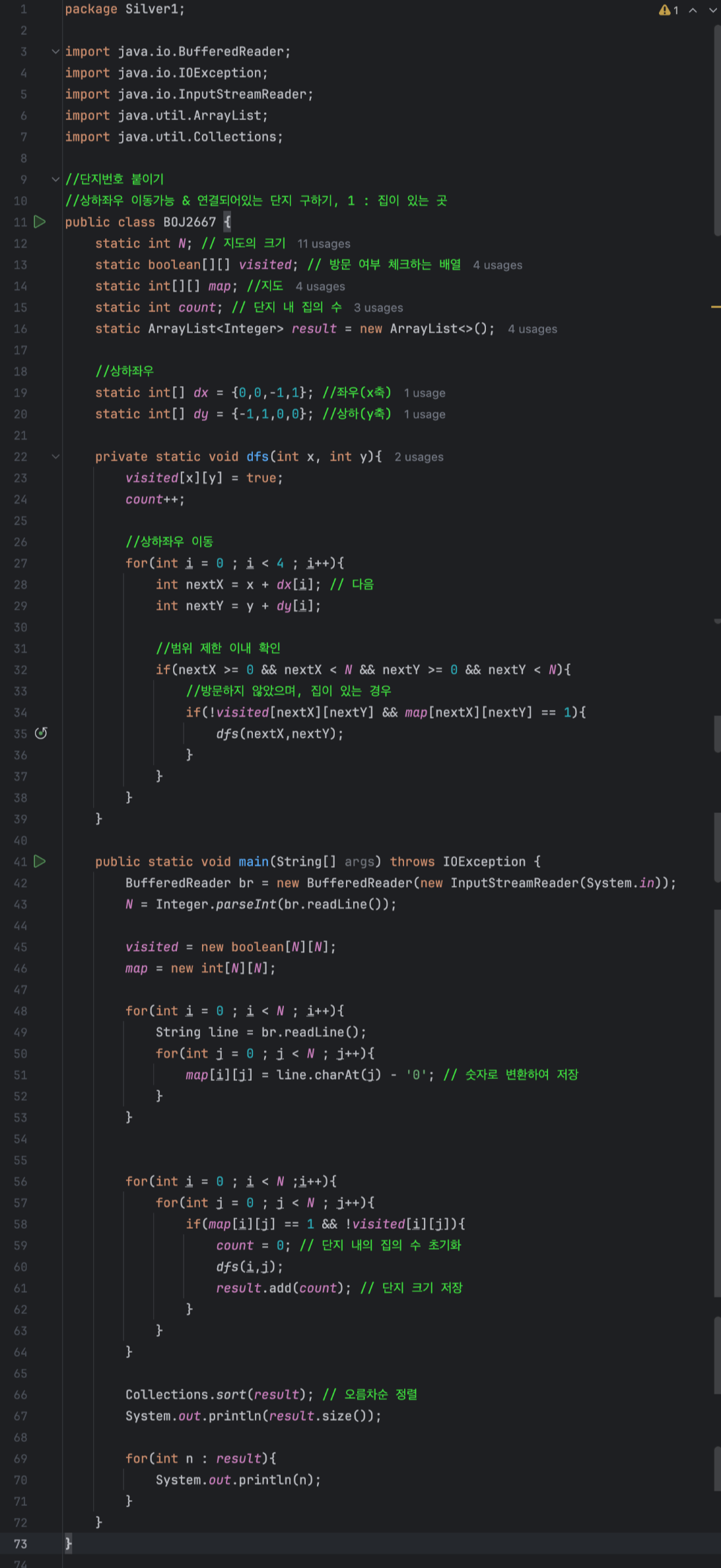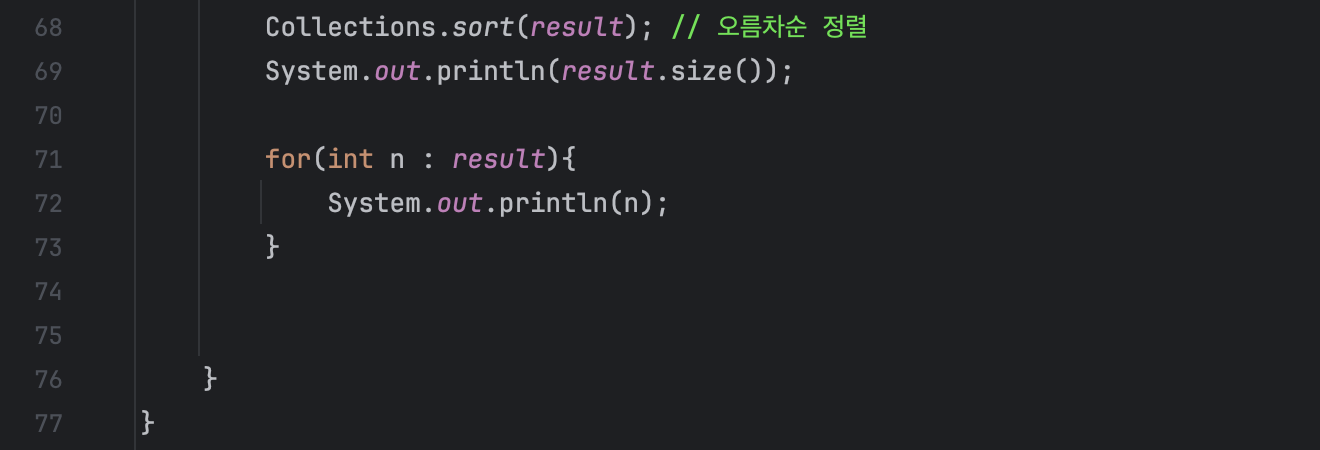 마지막으로 각 단지의 수가 저장되어 있는 result리스트를 오름차순(Default값)으로 정렬해 주고, size() 메서드를 사용하여 전체 단지 의 수를 출력하고, 향상된 for문을 사용하여 각 단지의 수를 오름차순으로 출력하여 마무리해 줍니다.