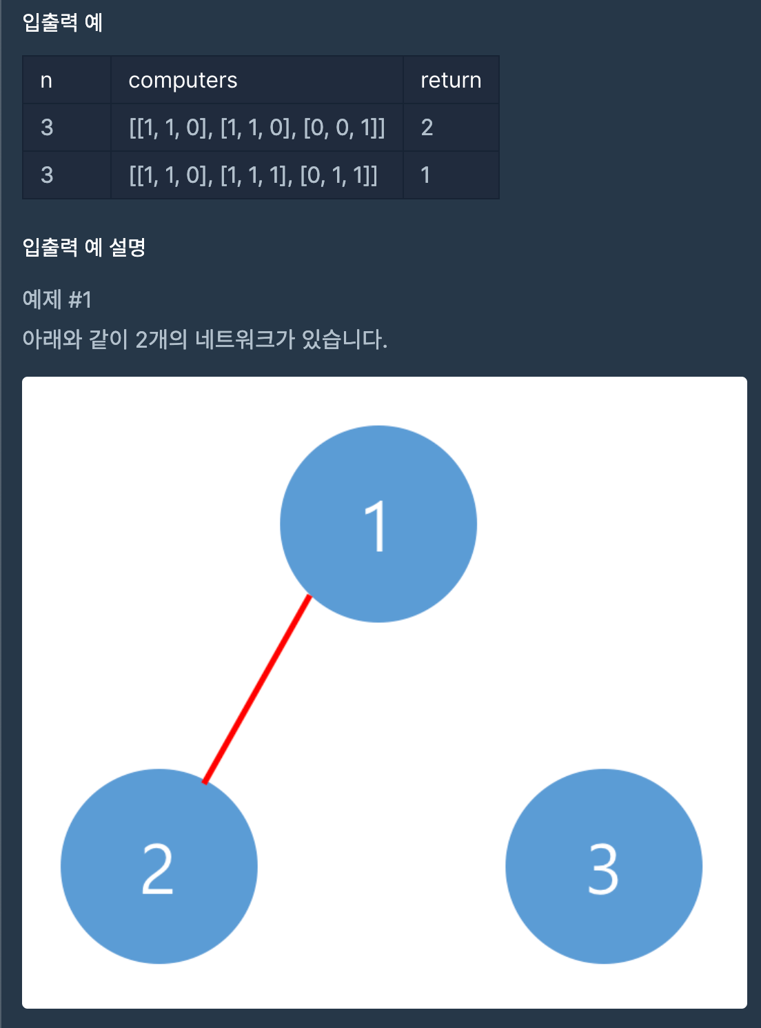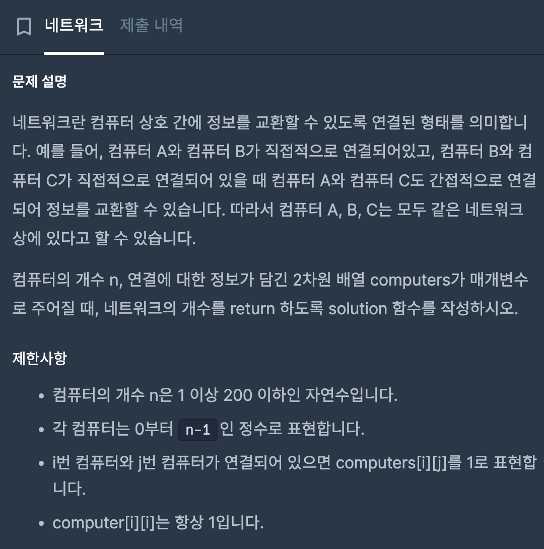 컴퓨터의 개수 N과 각 컴퓨터 간의 연결 상태를 나타내는 2차원 배열 computers가 주어질 때 서로 연결된 컴퓨터들을 하나의 네트워크로 간주하고 전체 네트워크의 개수를 리턴하는 문제입니다.