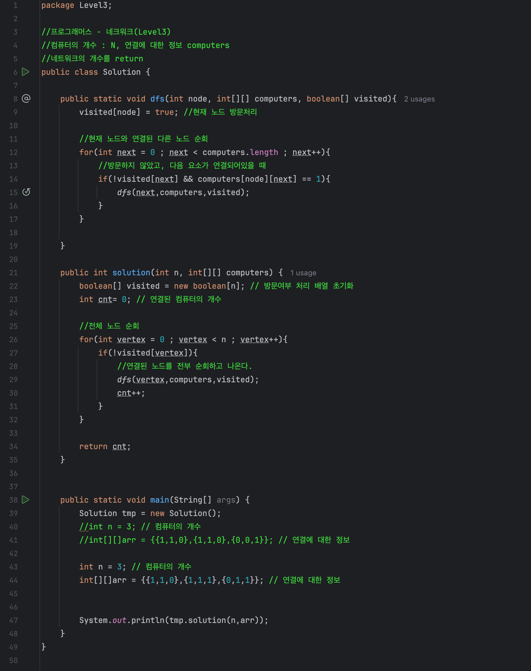 dfs함수를 나오면 연결된 모든 노드들을 순회하고 나오는데 만약 연결되어있지 않은 노드를 만난다면 해당 네트워크는 다른 네트워크이기 때문에 네트워크의 개수 cnt변수를 증가시켜 줍니다.