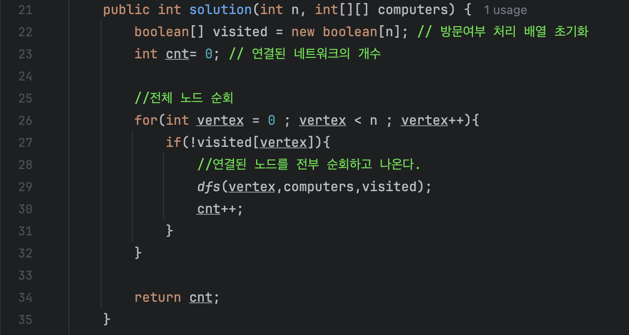 연결된 네트워크의 개수를 0으로 초기화해주고, 모든 노드들을 순회하는 반복문을 선언합니다.