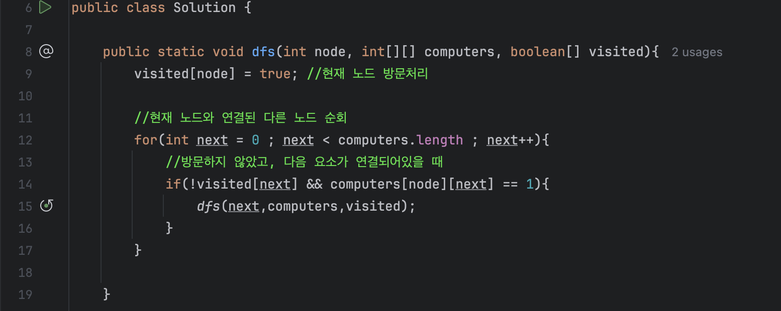 만약 해당 노드가 아직 방문하지 않은 노드라면, dfs를 수행하여 해당 네트워크의 모든 노드를 방문처리해 줍니다.