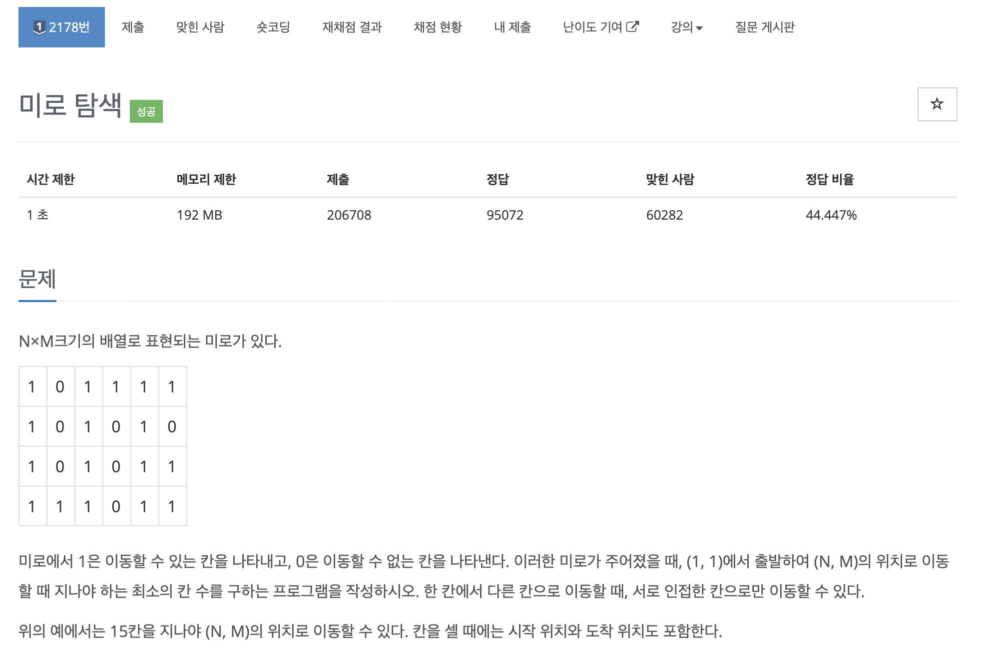 이번 문제는 N×M크기의 배열로 표현되는 미로가 있을 때 (1,1)에서 시작해서 주어진 (N, M)까지 가는 최단 거리를 출력하는 문제입니다.