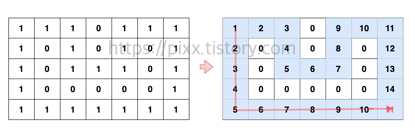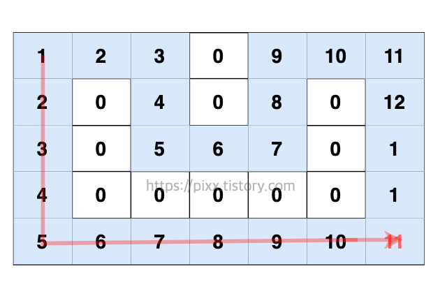 따라서 실제 입력이 위와 같이 입력된다면, 실제 미로는 아래와 같이 형성되게 됩니다. 따라서 (N-1, M-1) ➡️ (5,7)에 최단거리가 먼저 도달하기 때문에 count에 11가 저장되게 됩니다.