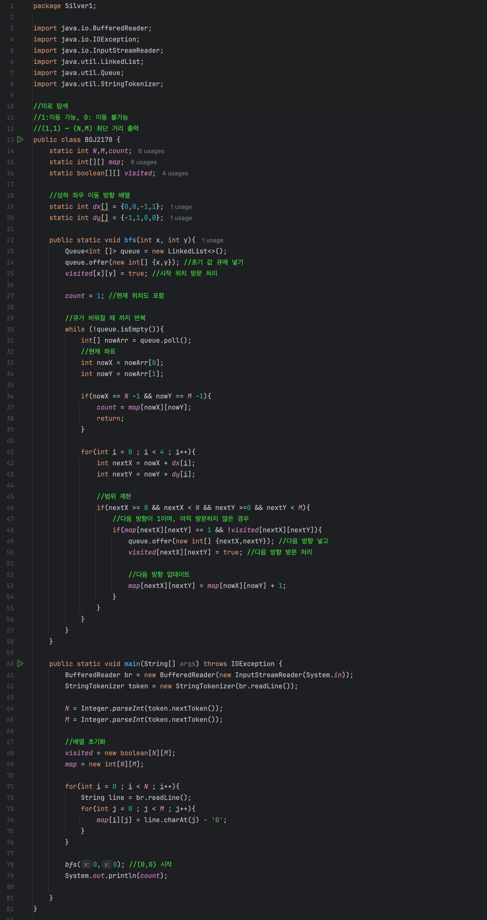 N x M의 배열로 표현되는 미로의 크기를 받아줄 N, M 그리고 미로 map, 방문 여부를 체크할 visited를 전역변수로 선언해 줍니다.
