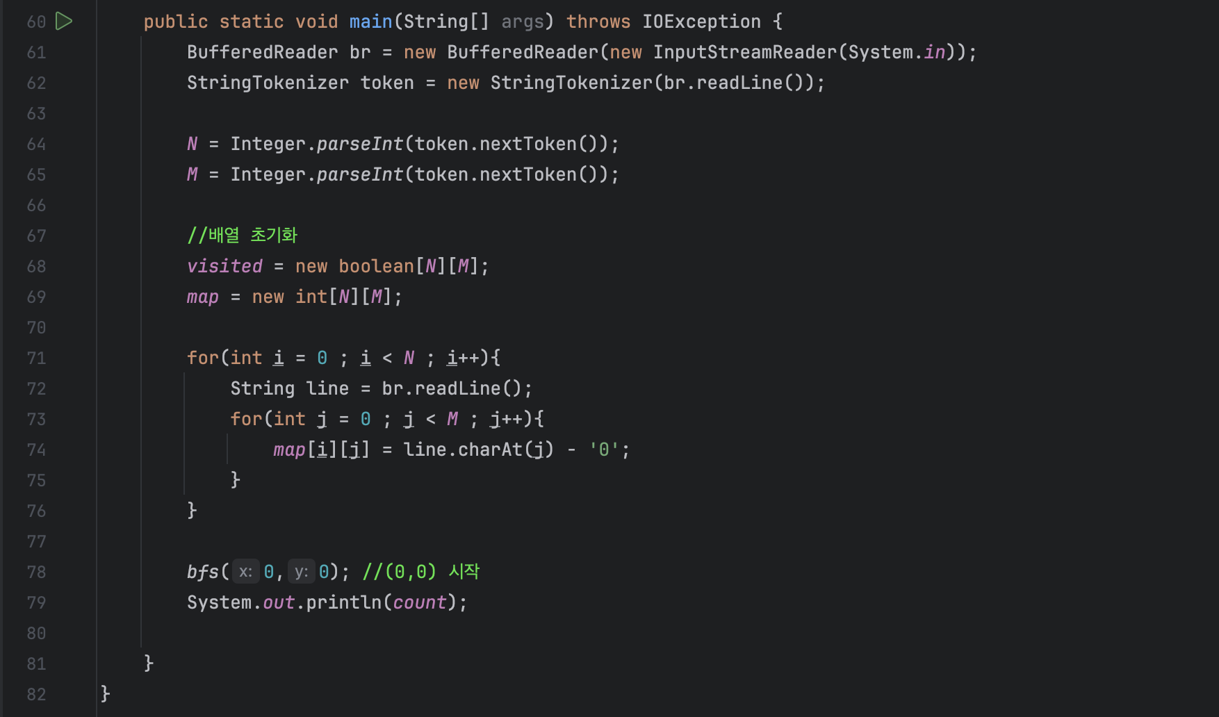 그리고 입력받은 가로 세로 크기만큼 미로와 방문 여부를 체크할 visited배열을 초기화를 해줍니다.