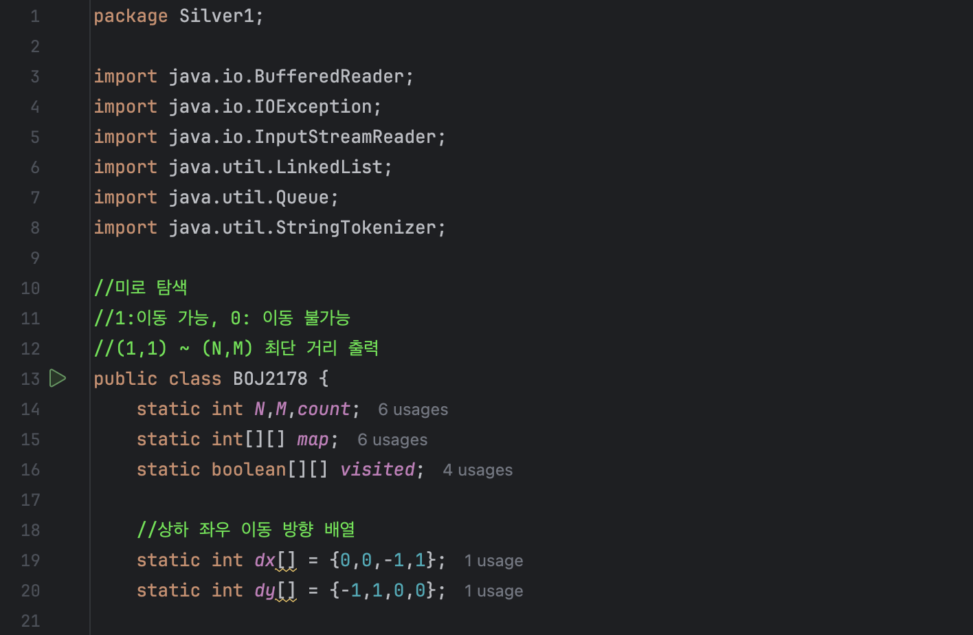 그리고 상하좌우로 이동할 dx와 dy를 초기화를 해줍니다. 이 방향 배열은 개인이 어느 방향으로 설정할지에 따라서 다릅니다.